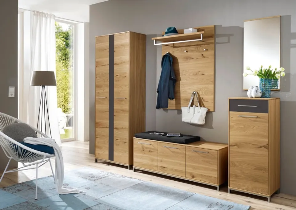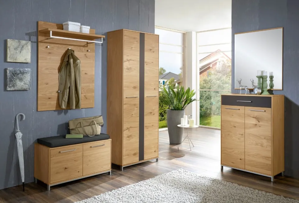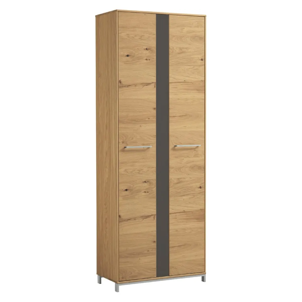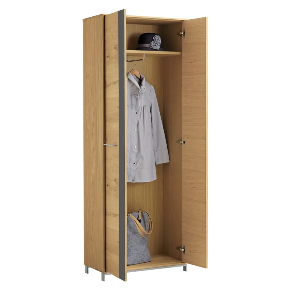 Sanfte Türdämpfung und hochwertige Eiche machen den Garderobenschrank Vedo zur idealen Wahl für dein Zuhause. Der Schrank besteht aus einem robusten Holzwerkstoff und ist furniert, was ihm eine edle Optik verleiht. Die Front aus Glas sorgt für einen modernen Touch und lässt deinen Eingangsbereich stilvoll wirken. Mit einer Kleiderstange ausgestattet, bietet der Vedo ausreichend Platz für deine Jacken und Mäntel. Sein durchdachtes Design und die Materialien versprechen Langlebigkeit und Eleganz. Setze auf den Garderobenschrank Vedo und schaffe Ordnung mit Stil in deinem Zuhause.