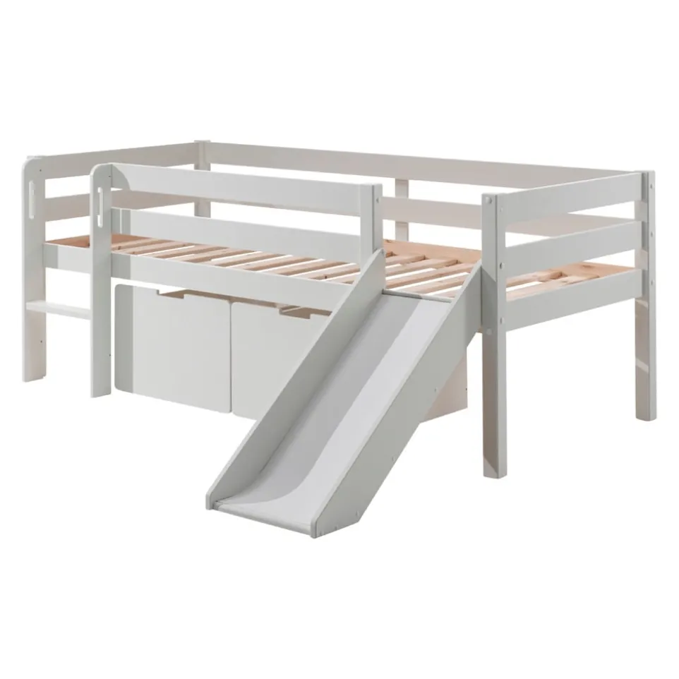 Das Mittelhochbett Pino von MID.YOU besticht durch seine vielseitigen Funktionen. Gefertigt aus massivem Kiefernholz, bietet es eine robuste und langlebige Schlaflösung. Die integrierte Rutsche sorgt für Spass und Abenteuer im Kinderzimmer, während die praktischen Schubladen zusätzlichen Stauraum bieten. Dank des inkludierten Lattenrosts wird der Aufbau erleichtert und du kannst sofort mit der Einrichtung beginnen. Dieses Bett ist nicht nur ein Schlafplatz, sondern auch ein kreativer Spielort, der die Fantasie anregt. Entscheide dich für das Mittelhochbett Pino und schaffe einen besonderen Ort zum Träumen und Spielen.
