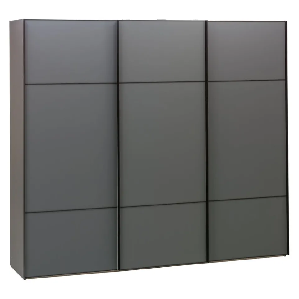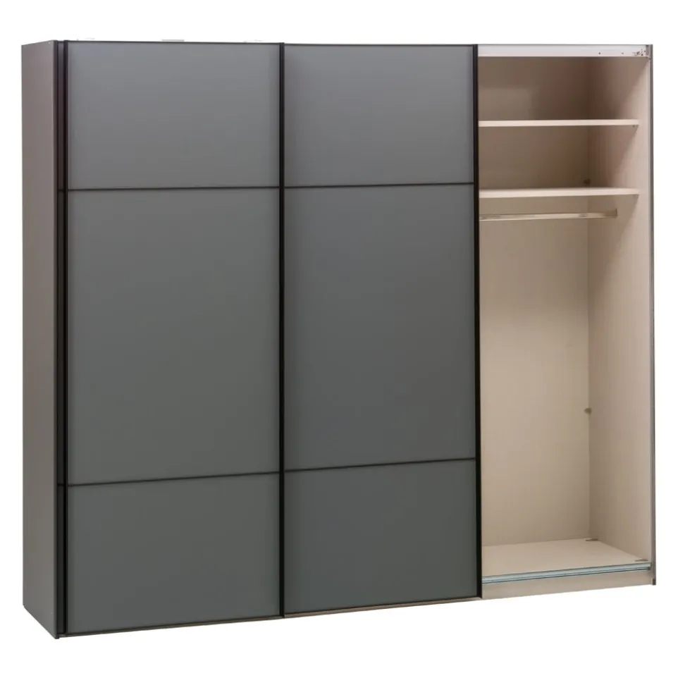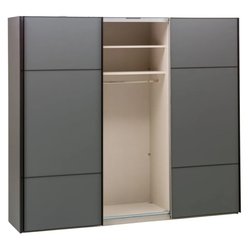 Kleiderschrank TAVIDO vereint Ästhetik und Funktionalität. Auf den Aussenseiten seiner 3 Schiebetüren ist mattes Farbglas in rauchiger Farbe angebracht, was dem Schrank einen besonders edlen Look verleiht. Dahinter verbergen sich 3 Abteile mit einer Kleiderstange und je 2 Tablaren. Der Schiebetürenschrank ist in verschiedenen Ausführungen erhältlich. Passend dazu finden Sie eine Kommode in unserem Online-Shop.