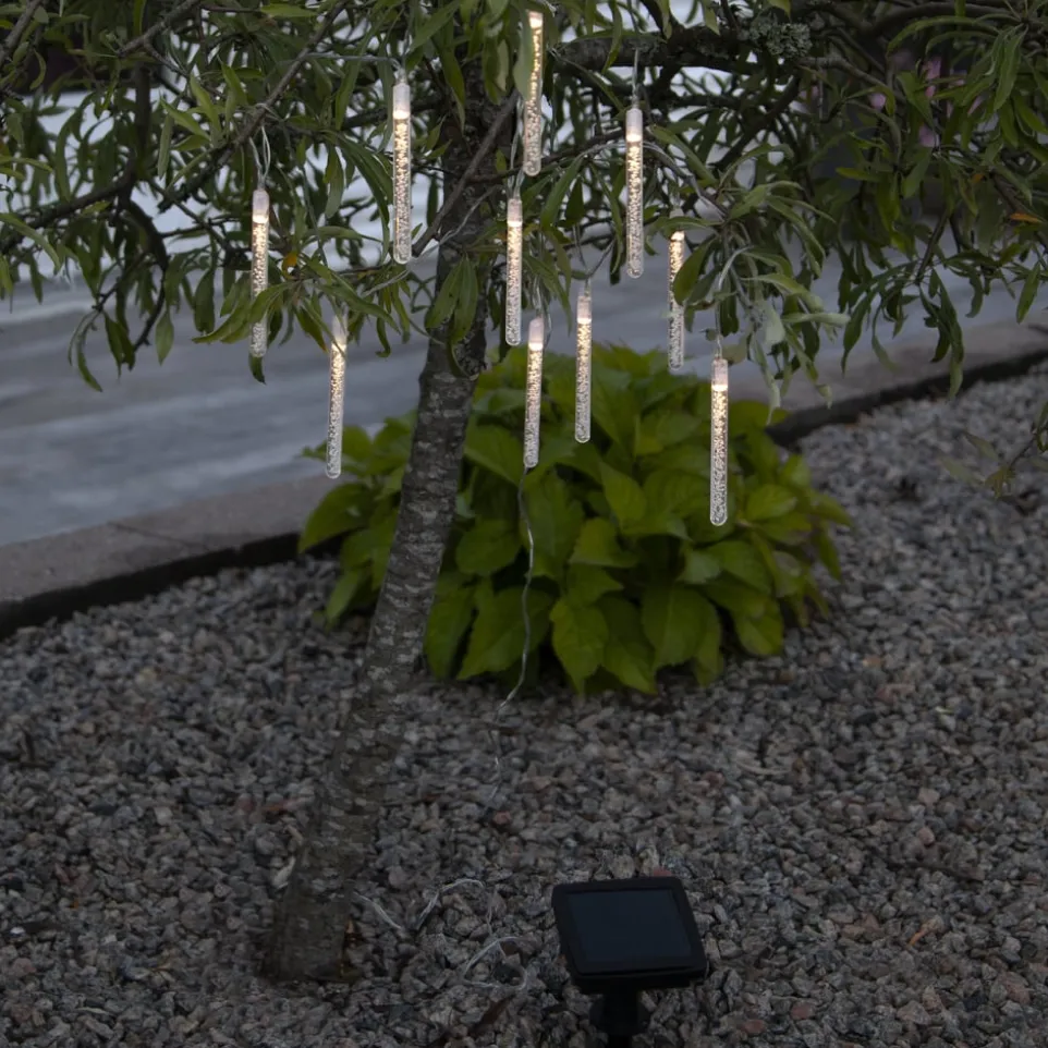 Mit der Solar-Lichterkette BUBBLY steht einem romantischen Abend im Garten nichts mehr im Wege. Die 10 Acrylstifte sind mit kleinen Lichtblasen gefüllt und sorgen für ein stimmungsvolles Ambiente. Dazu ist keine Steckdose nötig: Platzieren Sie einfach die schwarze Platte mit dem Solarpanel in der Sonne (Kabeldistanz zum letzten Acryl-Stick: 2m), um die mitgelieferten Batterien aufzuladen. Bei Dunkelheit aktiviert der Dämmerungssensor das Licht. Länge der Lichterkette: 180 cm.