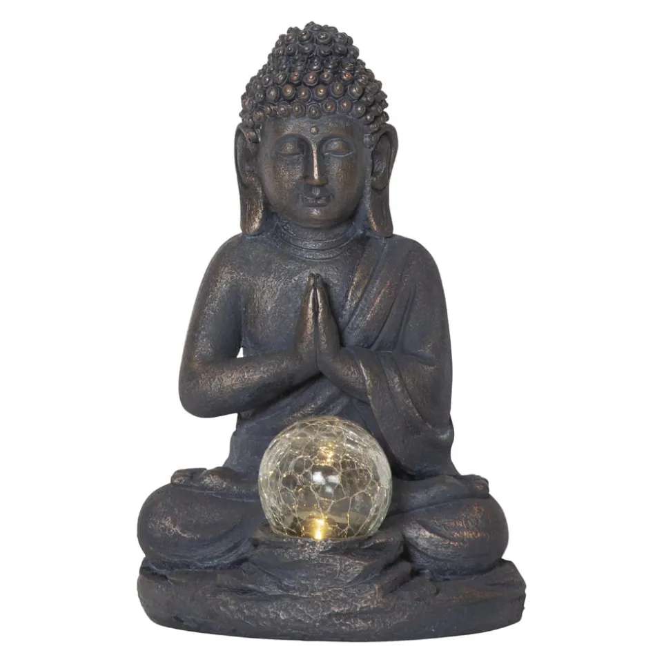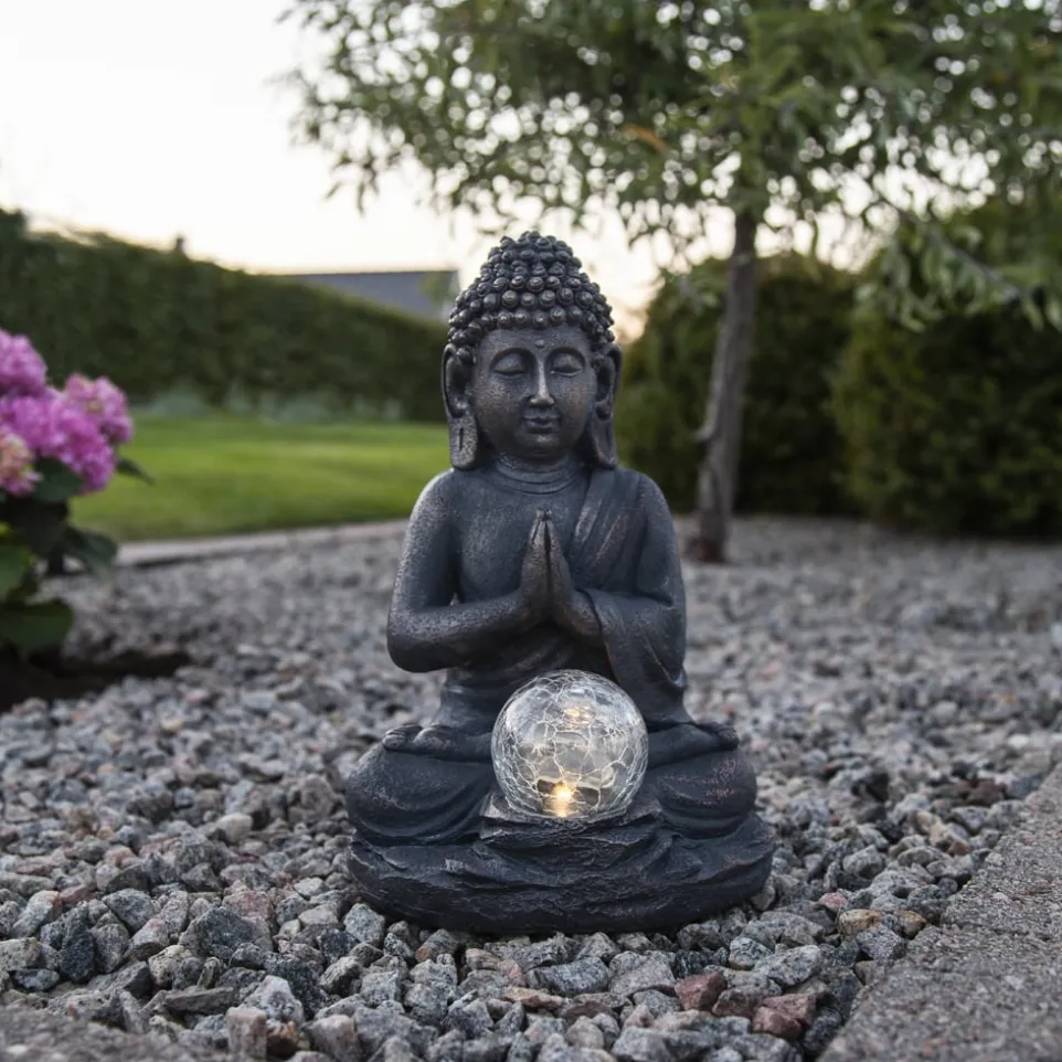 Buddha-Statuen gibt es viele. Doch diese hier hat besondere Strahlkraft: Sobald es dunkelt, reagiert der Dämmerungssensor und taucht die Glaskugel in warmes Licht. Die Beleuchtung funktioniert mit Solarenergie: Platzieren Sie die Statue tagsüber dort, wo die Sonne das Panel erreichen kann, um die mitgelieferten Batterien aufzuladen.