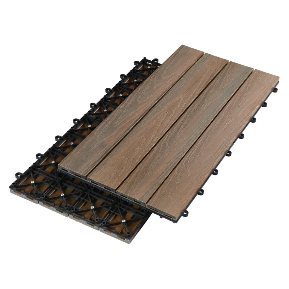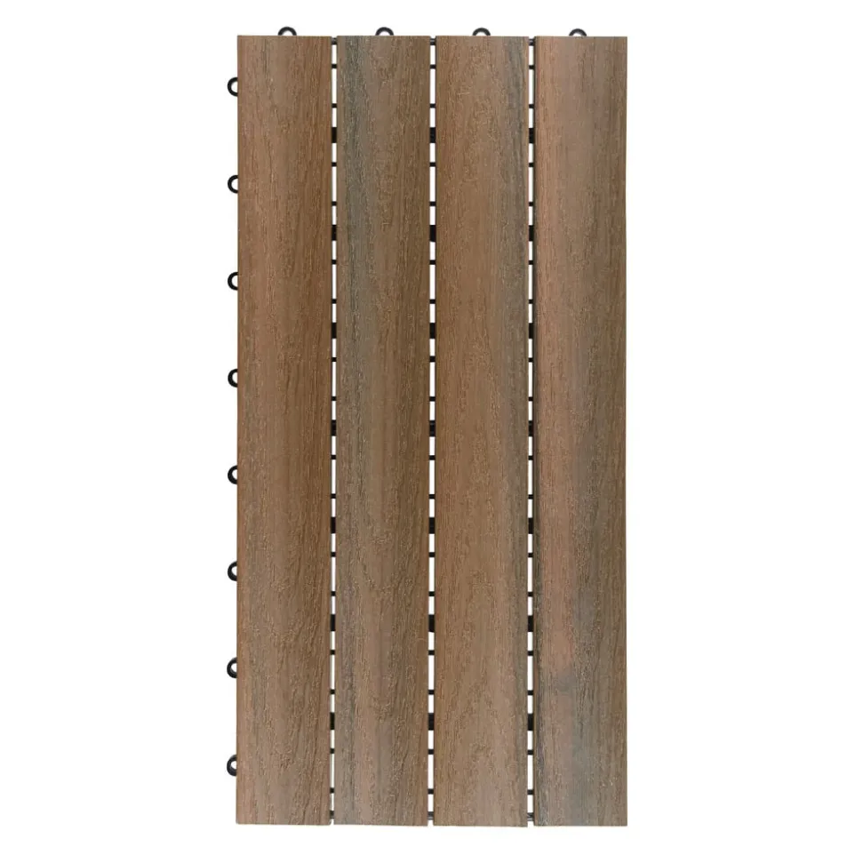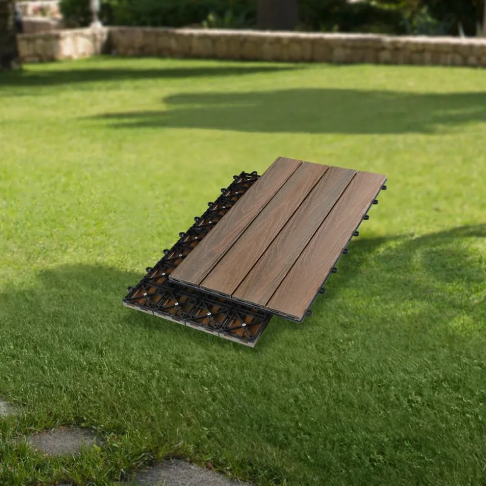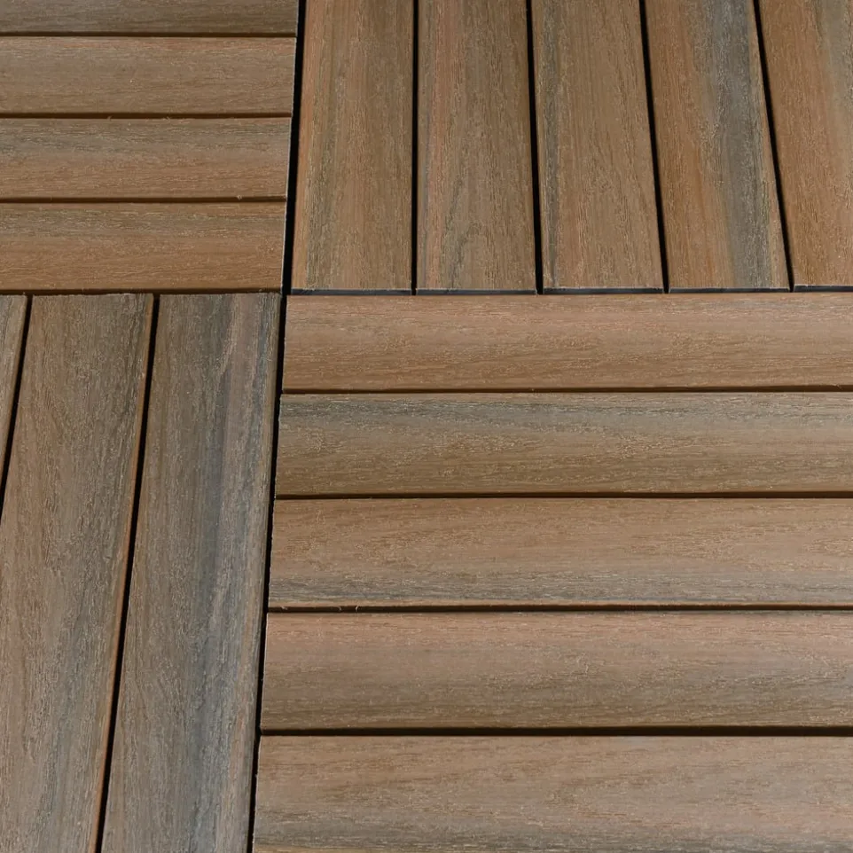 Verpassen Sie dem Boden Ihrer Terrasse ein heimeliges Gewand. Diese Bodenfliesen aus Holz-Kunststoff-Verbundwerkstoff sind rutschfest, UV-beständig und ideal für den Outdoor-Einsatz. Sie lassen sich einfach per Klick-System verlegen. Werden die Bodenplatten mit der Reliefoberfläche im Wechsel quer und längs angeordnet, entsteht ein dekoratives Schachbrettmuster. Preis pro Stück.
