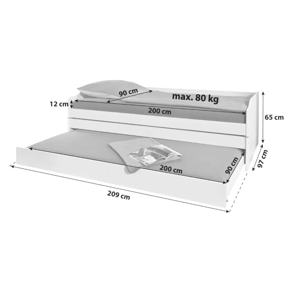 Das Ausziehbett ist ideal für kleine Räume. Die maximale Höhe der passenden Matratze für die Schublade beträgt 12 cm, z.B. 33865, Housse separat 38549 oder 38553.