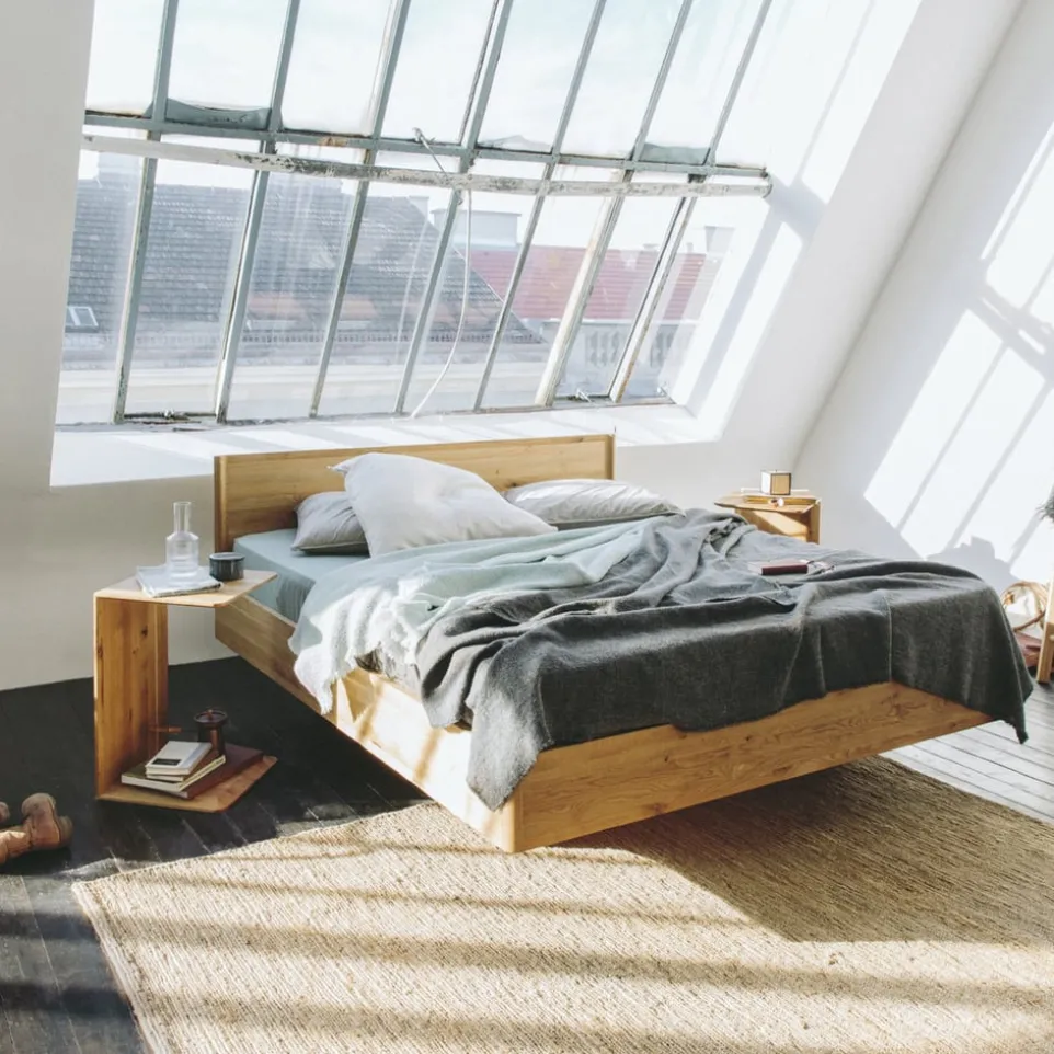 Unbeschwert und verträumt kommt TIMES T7 daher. Dank seiner unsichtbaren Beine sieht das Bett aus, als ob es fliegen könnte. Zur gleichen Zeit vermittelt das massive Eichenholz ein Gefühl der Geborgenheit. Der Rahmen ist komplett aus Naturholz gefertigt und verfügt anstelle von Metallschrauben über stabile Steckverbindungen. Das unbelastete Schlafumfeld schafft optimale Voraussetzungen für die nächtliche Regeneration. Zudem lässt sich das Bett bei einem Umzug unkompliziert ab- und aufbauen, so dass Sie auch in der neuen Wohnung nicht auf einen gesunden Schlaf verzichten müssen. Passend zum Bett ist Nachttisch CLIP in unserem Onlineshop erhältlich. Ohne Bettinhalt (exkl. Lattenrost, Matratze, etc.).