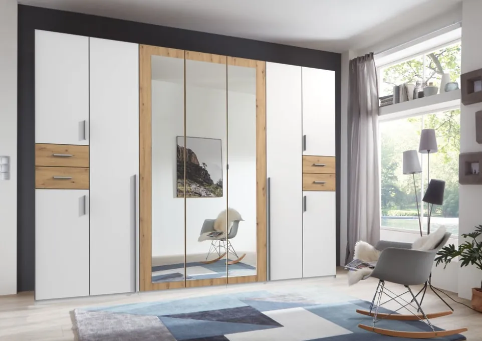 Mit dem Drehtürenschrank Vegas-201 von MID.YOU wird dein Schlafzimmer zum Organisationstalent. Neun Türen bieten reichlich Stauraum, während vier Schubladen und drei Kleiderstangen für Ordnung sorgen. Gefertigt aus hochwertigem Holzwerkstoff, überzeugt der Schrank durch seine Langlebigkeit und Robustheit. Die durchdachte Aufteilung ermöglicht eine übersichtliche Aufbewahrung deiner Kleidung und Accessoires. Der Vegas-201 vereint Funktionalität und Stil und passt sich harmonisch in jedes Raumkonzept ein. Entdecke die Vorteile dieses praktischen Drehtürenschranks und schaffe mehr Platz in deinem Zuhause.