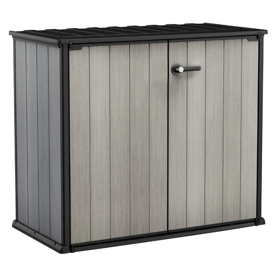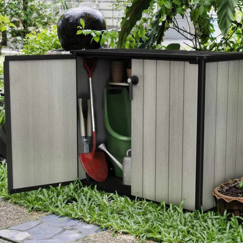 Geräteschrank PATIO STORE heisst die elegante Lagerlösung für Ihre Gartentools. Hier finden Möbel, Kissen oder Poolzubehör einen sicheren und trockenen Platz. Die Wände sind aus langlebigem Kunststoff und bewahren ihren rustikalen Charme über Jahre hinweg, ohne abzublättern. Sie sind beliebig anstreichbar, so dass Sie das Gartenhäuschen ganz nach Ihrem Gusto gestalten können.