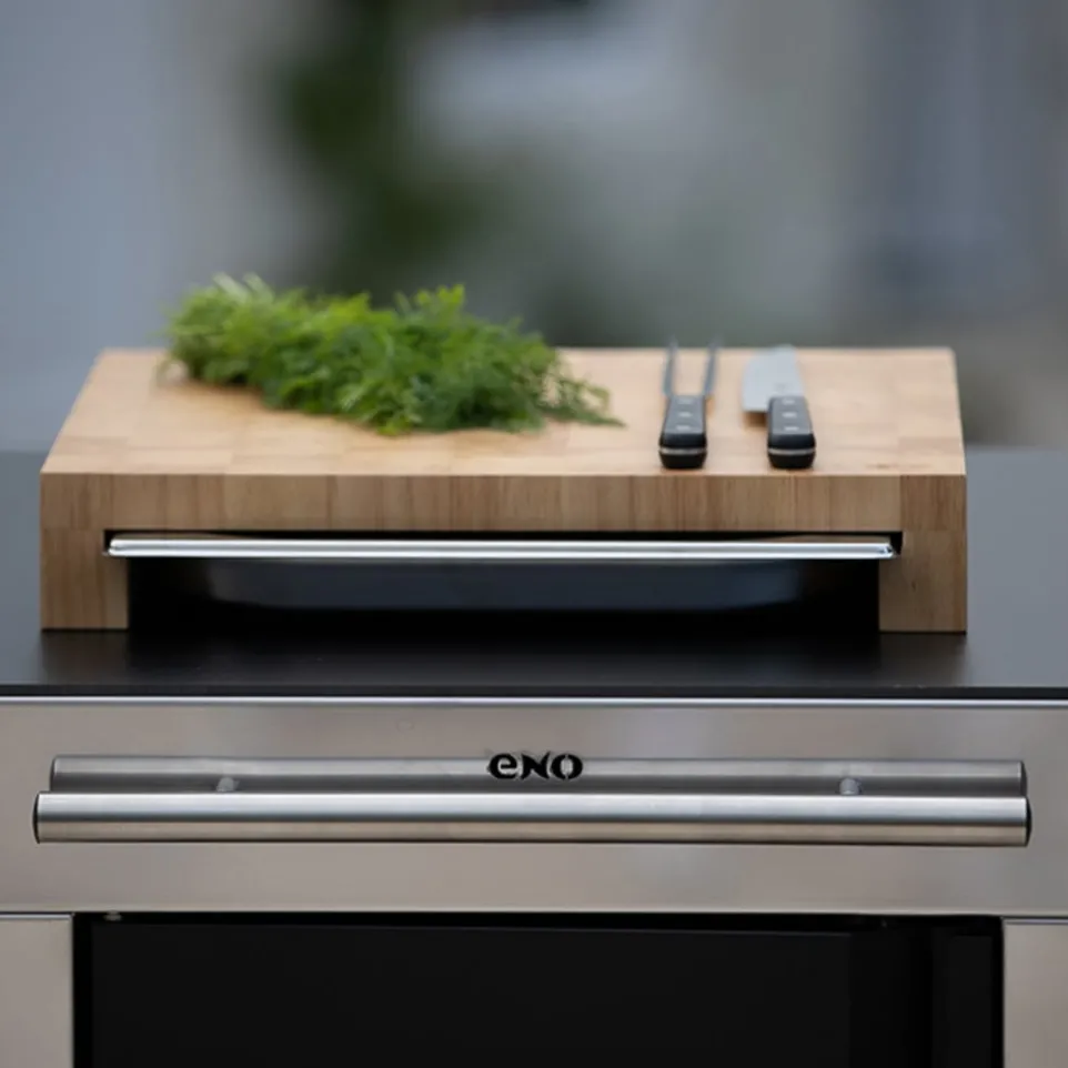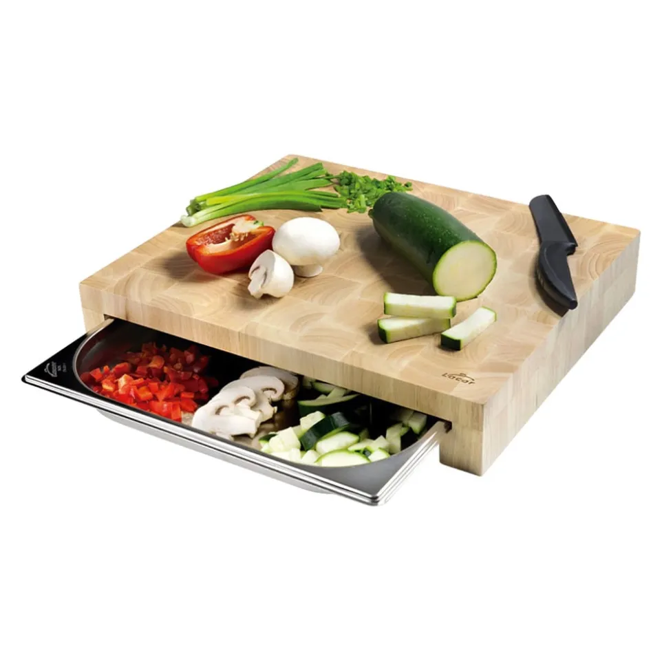 Kochen wie ein Profi: Dieses hochwertige Schneidbrett aus Gummiholz kommt inklusive Edelstahlschublade zum Aufbewahren von Lebensmitteln. Der Gastronormbehälter lässt sich leicht herausziehen und ist spülmaschinenfest.