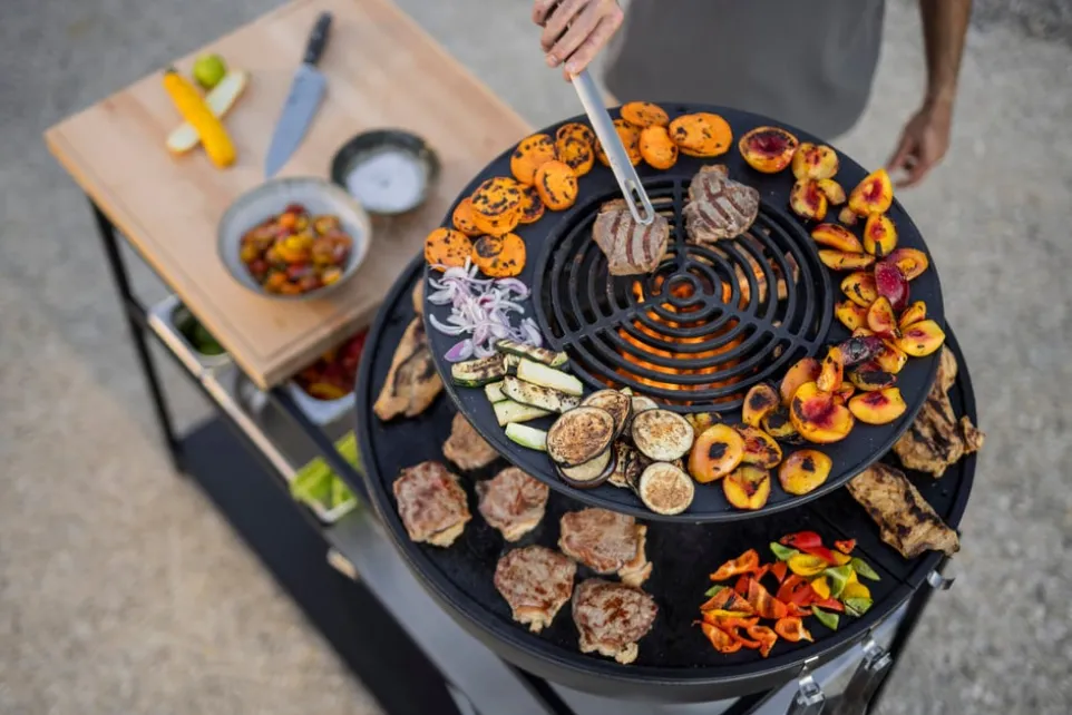 Der BOWL 57 Warmhaltering von Höfats erweitert dein Grillerlebnis mit 60 % mehr Platz über den offenen Flammen. Diese vielseitige Gusseisenplatte ist ideal, um fertige Speisen warmzuhalten oder empfindliches Grillgut schonend zu garen. Einfach auf den Haltering des Sear Grate gelegt, bietet sie eine praktische Ablagefläche rund um eine Eisenpfanne oder als zusätzliche Grillebene über dem Plancha-Ring. Erlebe die zahlreichen Nutzungsmöglichkeiten und entdecke neue Facetten deines Grillens. Egal, ob Brot, Gemüse oder Fleisch – die Gusseisenplatte Bowl 57 passt sich deinen kulinarischen Kreationen flexibel an.