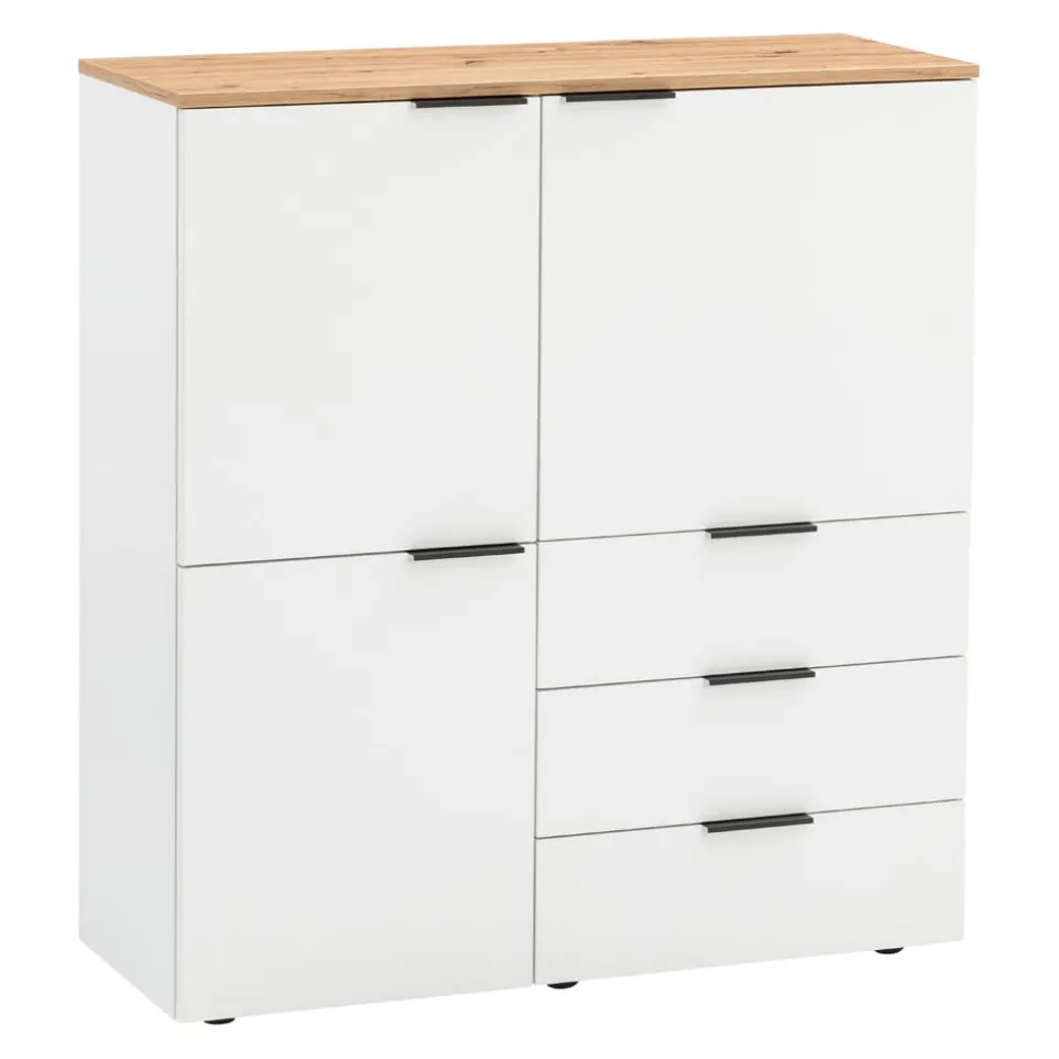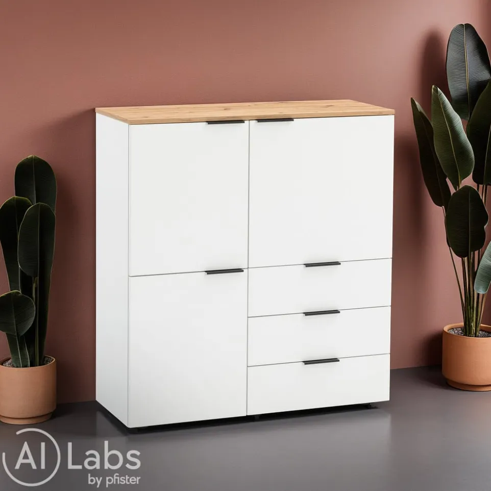 Mit drei grosszügigen Türen und drei Schubladen bietet das Sideboard Weber von one optimalen Stauraum für dein Zuhause. Hergestellt aus hochwertigem Holzwerkstoff, überzeugt es mit seiner langlebigen Spanplatte. Die Kunststoffgleiter sorgen für einen sicheren Stand und schützen deinen Boden. Dieses Sideboard vereint Funktionalität und zeitloses Design, das sich perfekt in verschiedene Wohnstile einfügt. Ob im Wohnzimmer, Esszimmer oder Flur – das vielseitige Möbelstück sorgt überall für Ordnung und Stil. Setze mit dem Sideboard Weber von one einen eleganten Akzent in deinem Zuhause und geniesse die praktische Aufbewahrungslösung.