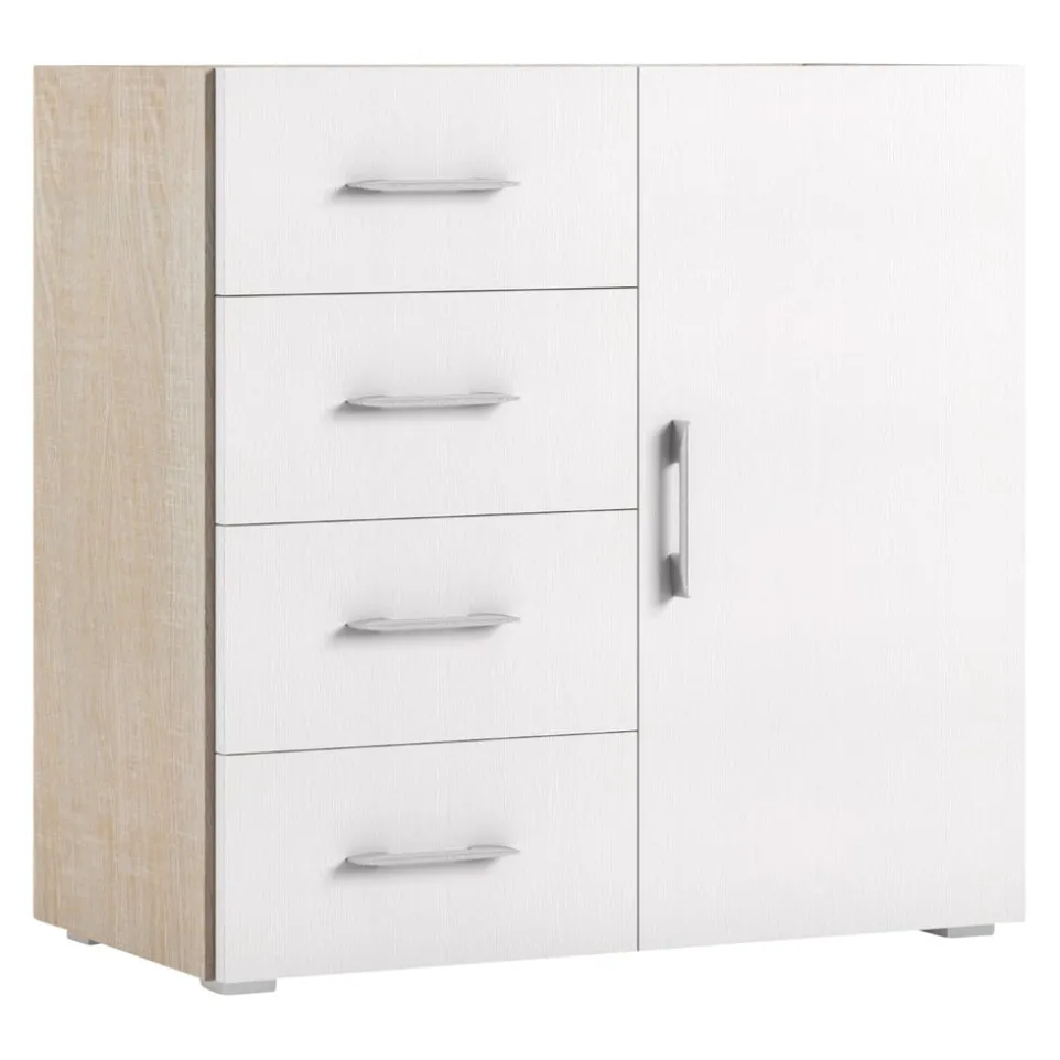 Mit der Sikelia Kommode Living erhältst du eine stilvolle Lösung für dein Zuhause. Diese Kommode verfügt über vier geräumige Schubladen und eine Tür, die allesamt aus hochwertiger Spanplatte gefertigt sind. Das Möbelstück besticht durch seine robuste Bauweise und das hochwertige Holzwerkstoff-Material. Die Kommode Living ist nicht nur praktisch, sondern auch nachhaltig, denn sie trägt das FSC®-Mix-Zertifikat. Dieses Zertifikat garantiert, dass das verwendete Material aus verantwortungsvoll bewirtschafteten Wäldern stammt. Gönne deinem Wohnraum eine zeitlose und umweltfreundliche Ergänzung mit der Sikelia Kommode Living.