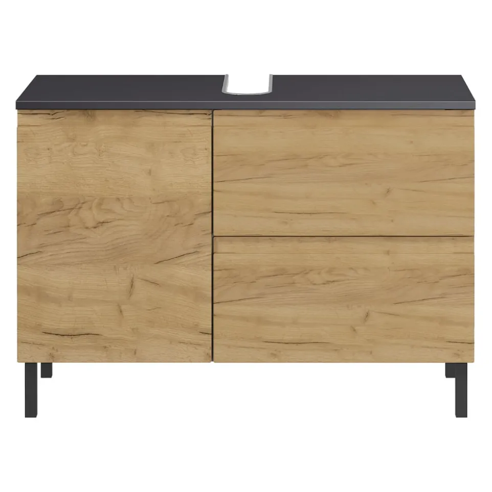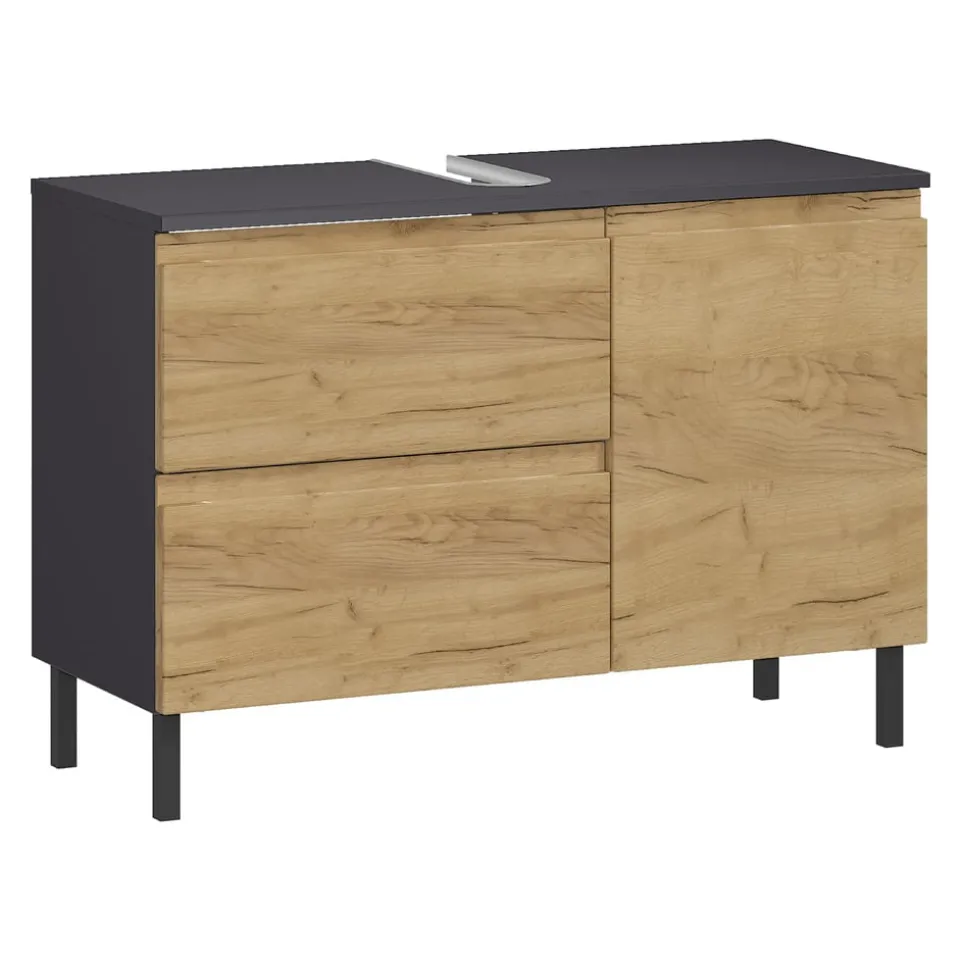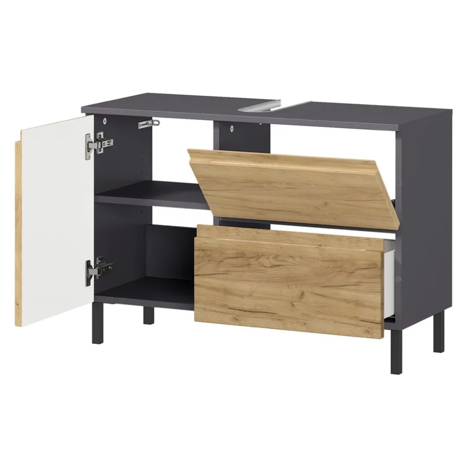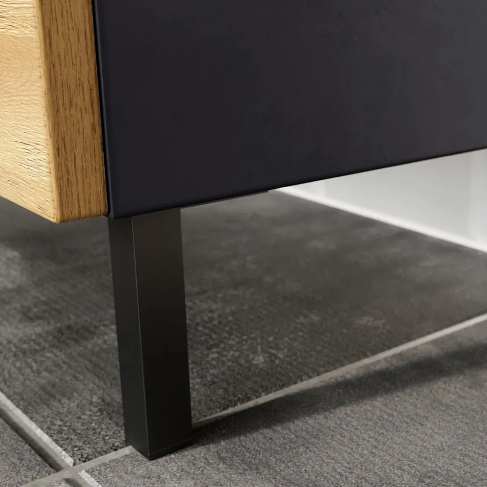 Stauraum trifft Stil. Und das ganze in Ihrem Badezimmer! Die Badmöbelserie SALINAS sorgt mit elegantem Grau und hochwertiger Holzoptik für ein besonders stilvolles Spa-Erlebnis. Der gezeigte Lavaboy bietet Platz hinter 1 Tür, 1 Klappe mit Soft-Close-System und in 1 Schublade mit Selbsteinzug und Dämpfung. 1 Tablar ist verstellbar.