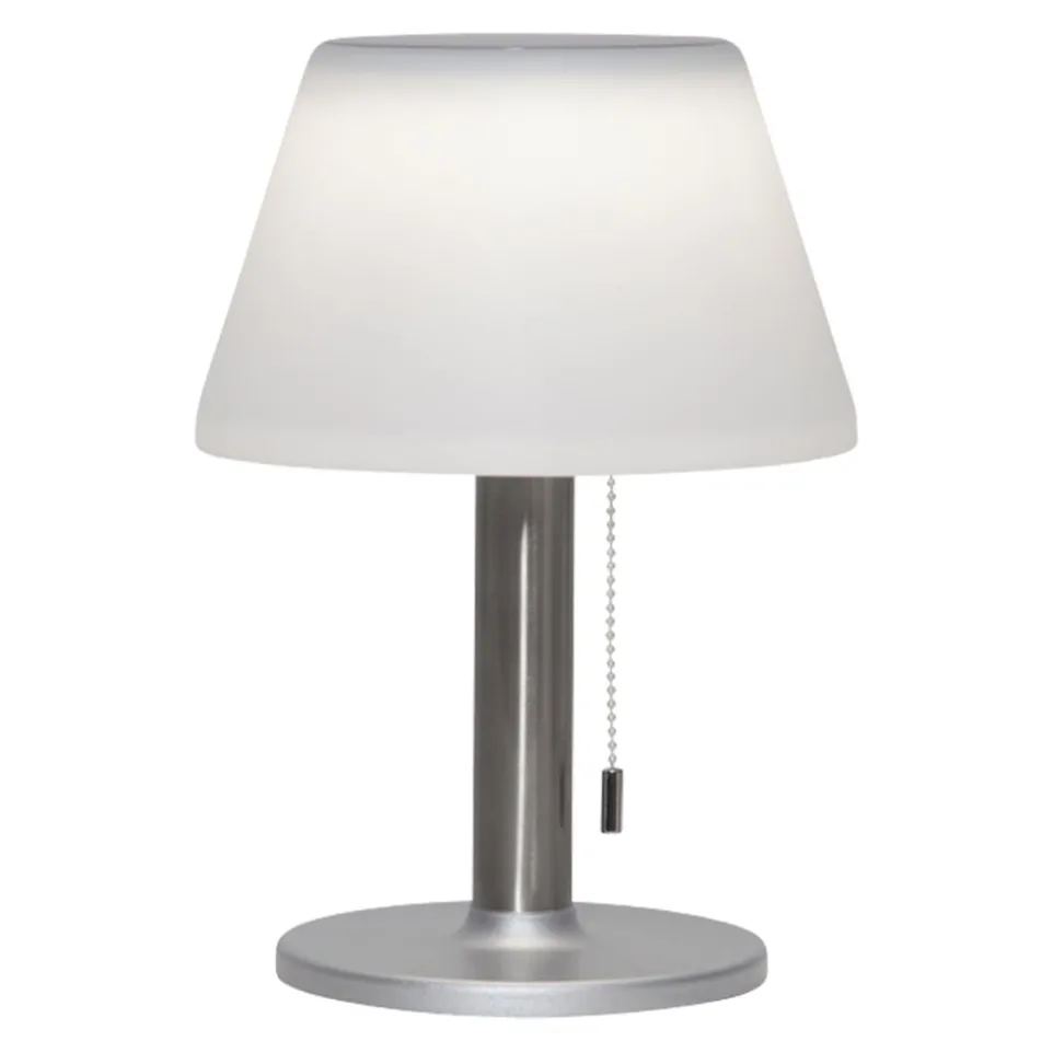SOLIA ist ein Multitalent. Die Solartischleuchte kommt im klassischen Stil daher. Über die Ziehkette sind 3 Helligkeitsstufen wählbar. Im Lampenschirm ist ein Solarpanel integriert, das die Batterie bei Sonnenlicht auflädt. Je nach Helligkeitsstufe beträgt die Laufzeit bis zu 4 Stunden. Ein- und Ausschalten lässt sich die kabellose Outdoor-Leuchte über einen Schalter im Schirm.
