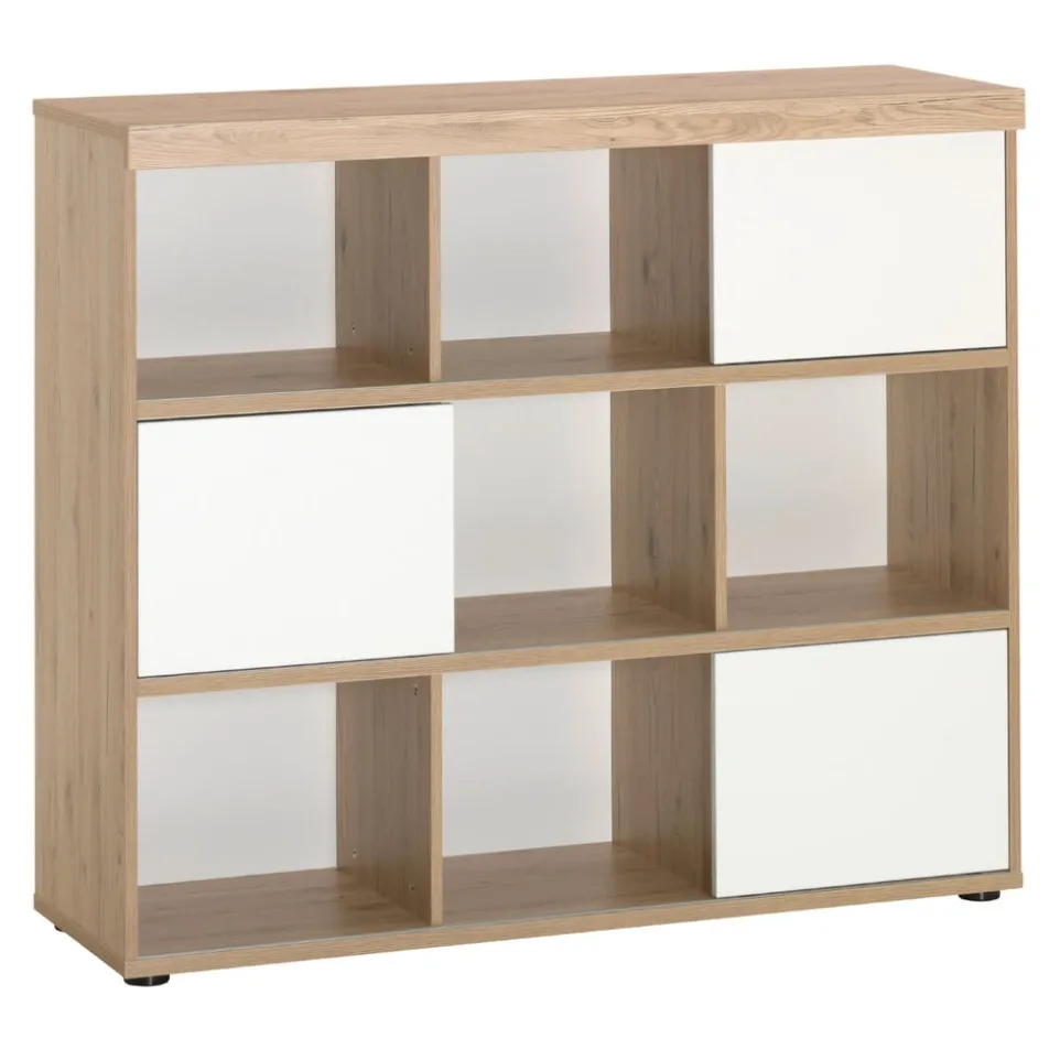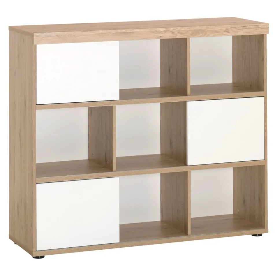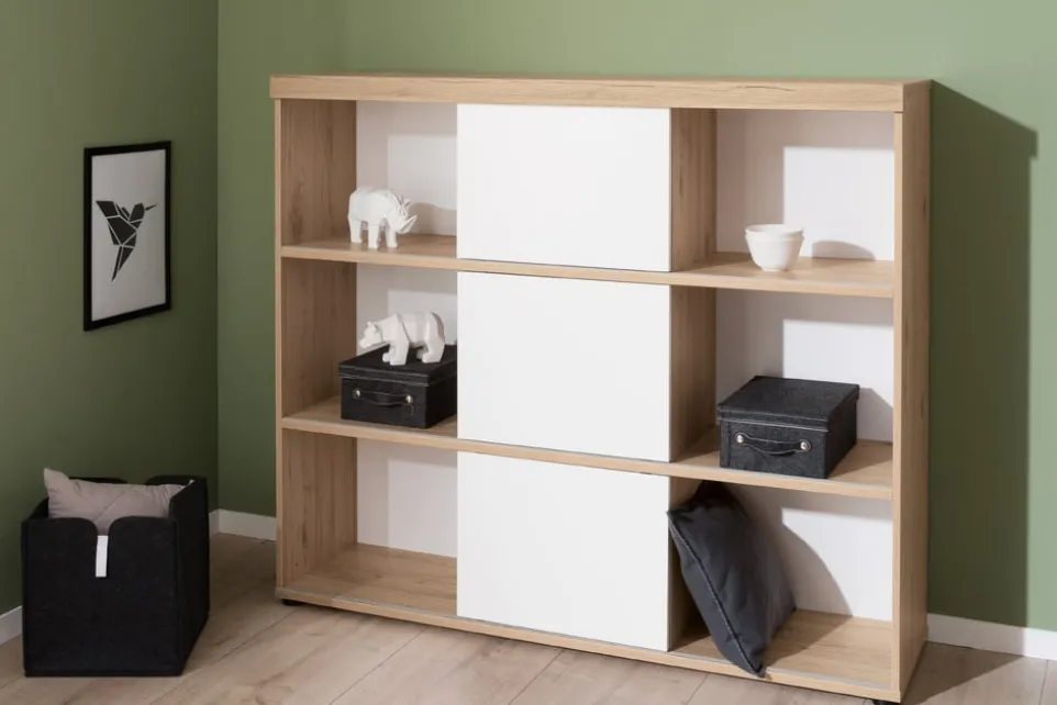 Mit seinen drei praktischen Schiebetüren bietet das Regal Fionn von PAIDI eine flexible und platzsparende Lösung für dein Zuhause. Die Türen lassen sich bequem von links nach rechts verschieben, was dir eine einfache Handhabung und einen schnellen Zugriff auf alle Bereiche des Regals ermöglicht. Gefertigt aus hochwertigem Holzwerkstoff, vereint dieses Möbelstück Langlebigkeit und Ästhetik in einem. Die Kombination aus durchdachter Funktionalität und natürlichem Material macht das Regal Fionn zu einer idealen Wahl für jeden Raum. Lass dich von der Qualität und dem Design überzeugen und schaffe Ordnung mit Stil.