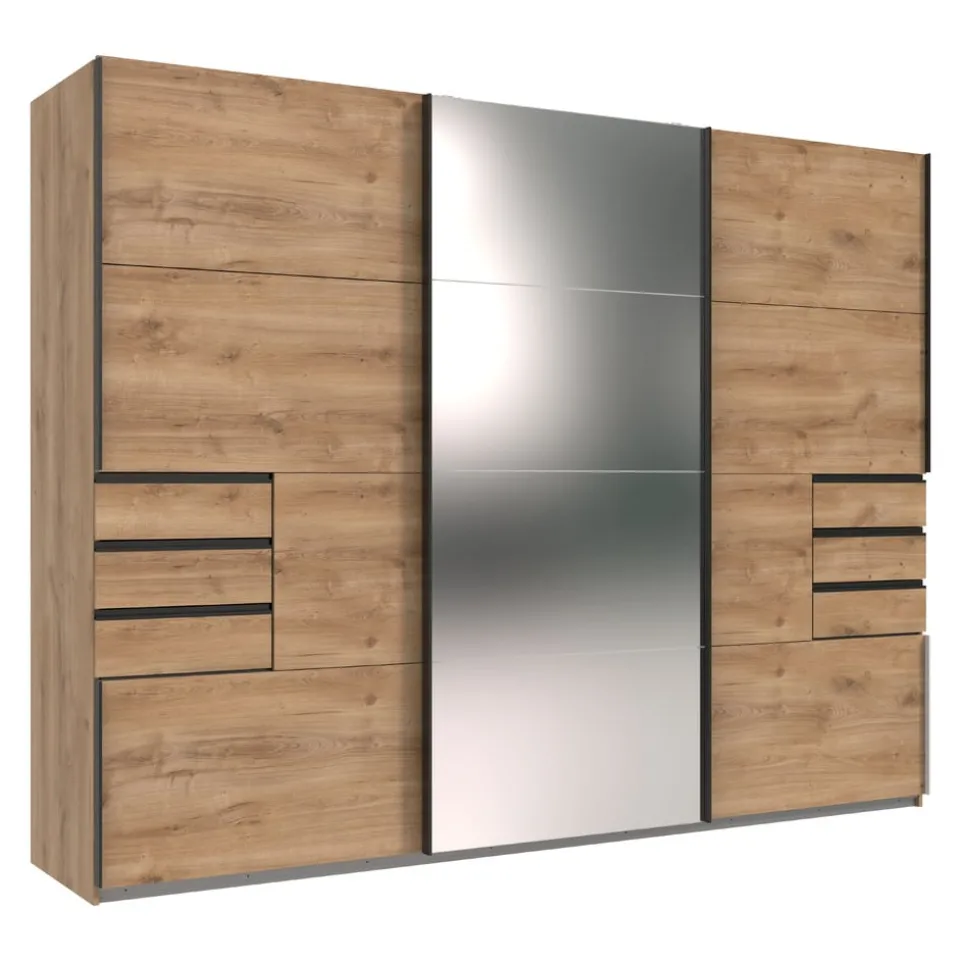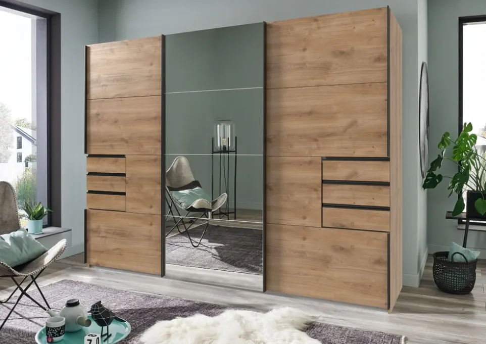 Der Schiebetürschrank Saigon von MID.YOU beeindruckt durch seine eleganten Glas Spiegelglas-Fronten, die deinem Raum eine besondere Note verleihen. Mit seinen drei Türen und sechs geräumigen Schubladen bietet er dir ausreichend Stauraum für all deine Kleidungsstücke. Zwei Kleiderstangen sorgen dafür, dass du deine Kleidung knitterfrei aufhängen kannst. Der Schrank besteht aus hochwertigem Holzwerkstoff, was ihn robust und langlebig macht. Das moderne Design und die praktische Aufteilung machen den Schiebetürschrank Saigon zu einem perfekten Begleiter für dein Schlafzimmer. Hol dir diesen stilvollen und funktionalen Schrank in dein Zuhause.