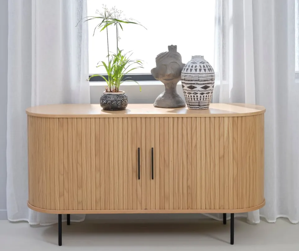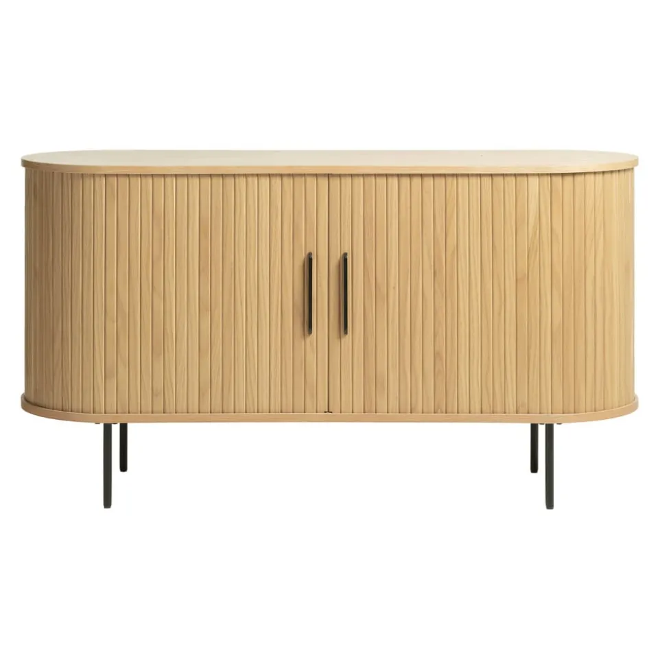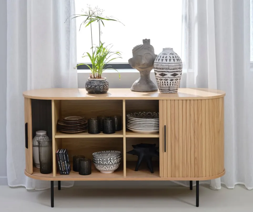 Mit dem Sideboard Nola von Lomoco bringst du Eleganz und Funktionalität in dein Zuhause. Die zwei praktischen Schiebetüren aus hochwertigem Eichenholz und robustem MDF bieten viel Stauraum und sind ein stilvoller Blickfang. Die Holzwerkstoff-Konstruktion sorgt für Stabilität und Langlebigkeit. Das Sideboard Nola eignet sich perfekt als vielseitiges Kastenmöbel, das sich nahtlos in verschiedene Einrichtungsstile einfügt. Egal, ob du es im Wohn-, Ess- oder Arbeitszimmer platzierst, dieses Möbelstück überzeugt durch seine hochwertige Verarbeitung und zeitloses Design. Bereichere deinen Wohnraum mit dem Sideboard Nola von Lomoco.