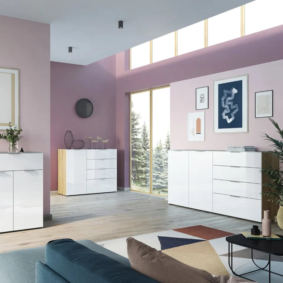 Sideboard OAKLAND bietet in 4 Schubladeen mit Selbsteinzug und Dämpfung und hinter 2 Türen mit Soft-Close-System viel Raum für Ihr alltägliches Allerlei. Die bewährte Kombination aus Holz und Glas sorgt für eine harmonische, unaufgeregte und hochwertige Optik, mit der die Kommode sich in jeden Raum integrieren lässt. Verschiedene Farbversionen erhältlich.