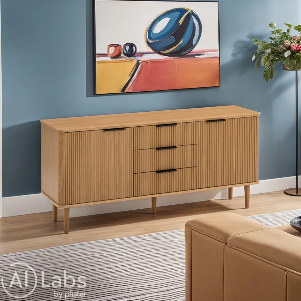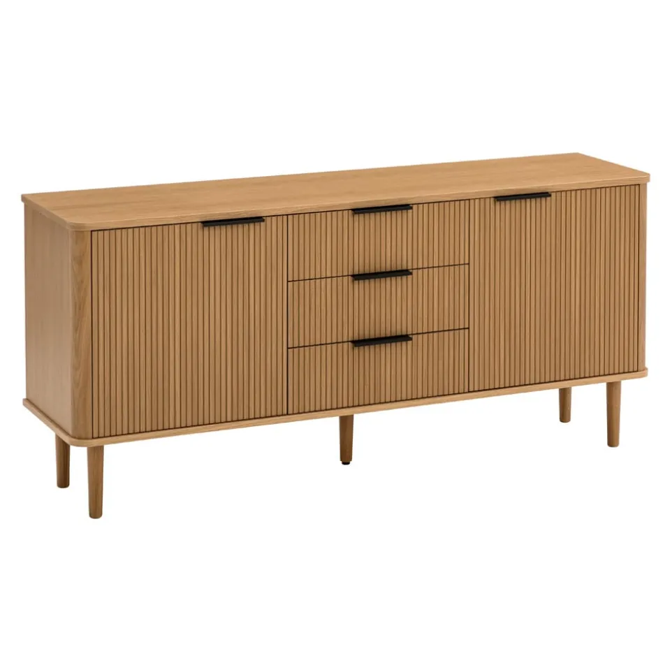 Zeitlose Eleganz trifft auf hochwertige Verarbeitung: Das Sideboard Skasen von edy&liv ist ein wahres Schmuckstück aus Eichenholzwerkstoff. Mit seiner furnierten Oberfläche bringt es natürliche Wärme und Stil in dein Zuhause. Drei geräumige Schubladen bieten dir genügend Stauraum für alle wichtigen Dinge. Das Sideboard ist nicht nur praktisch, sondern auch ein nachhaltiges Möbelstück. Es trägt das FSC®-Mix-Zertifikat, das für verantwortungsvolle Waldwirtschaft steht. Perfekt für jedes Wohnzimmer oder Esszimmer, vereint das Sideboard Skasen Funktionalität und Ästhetik in einem zeitgemässen Design. Hole dir dieses elegante Sideboard nach Hause.