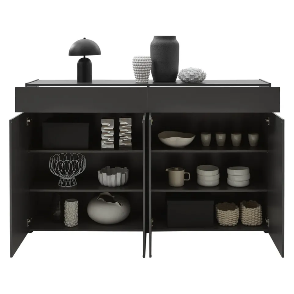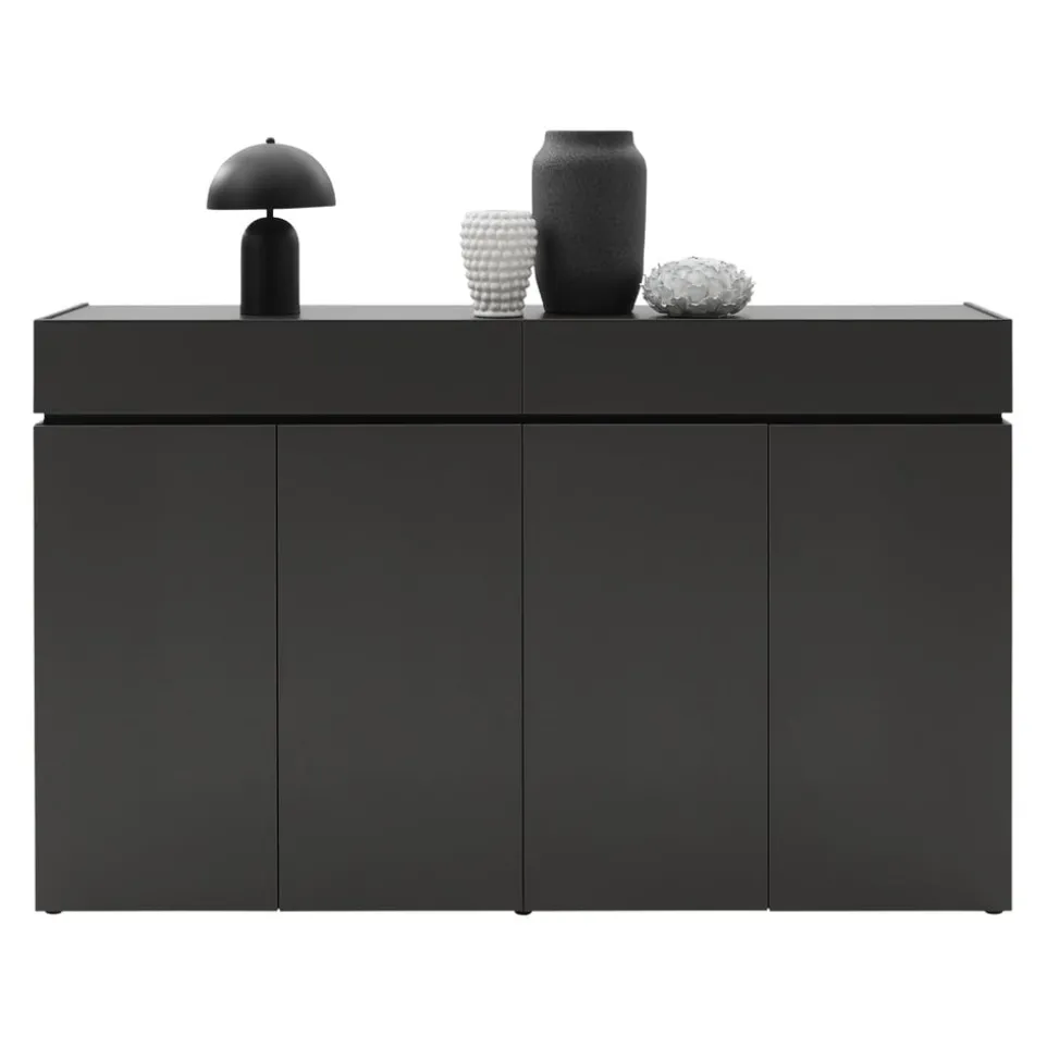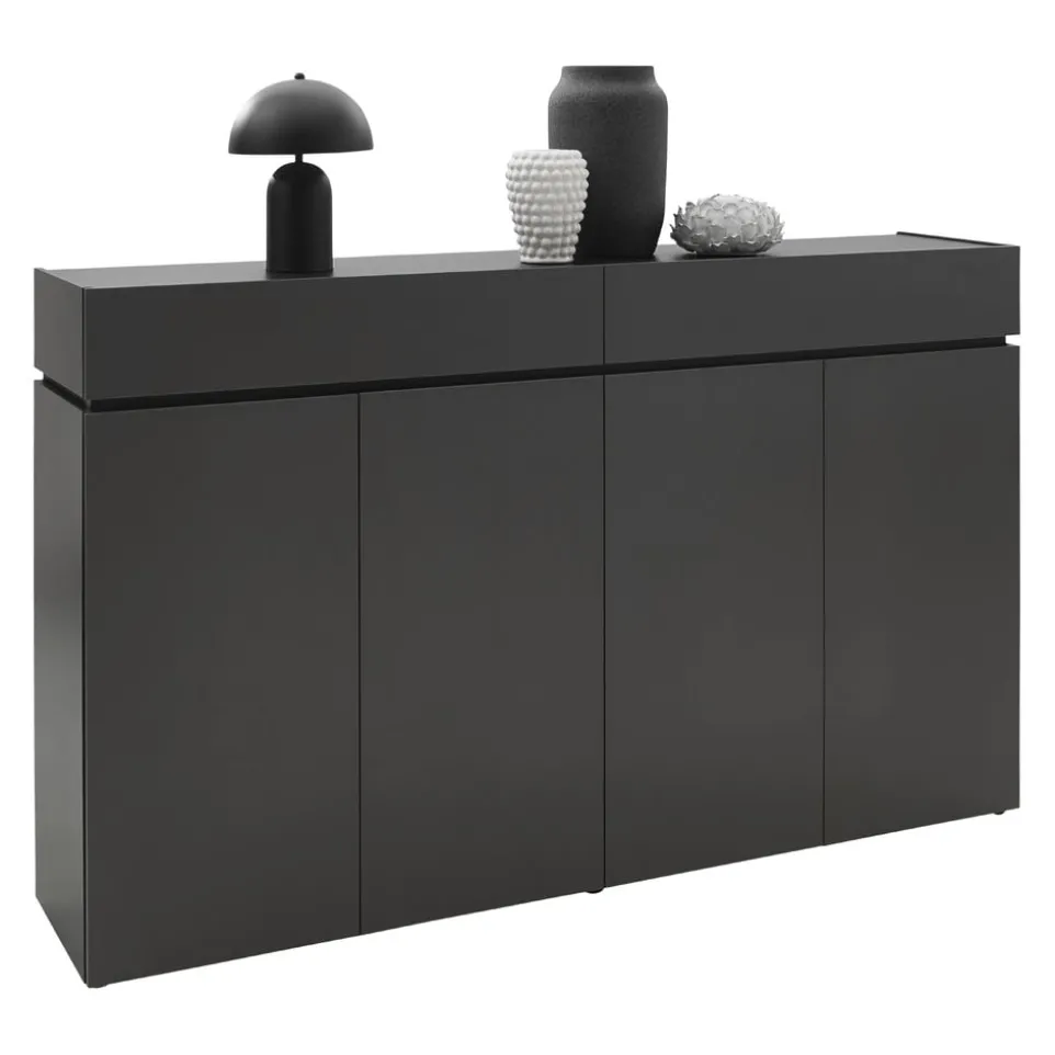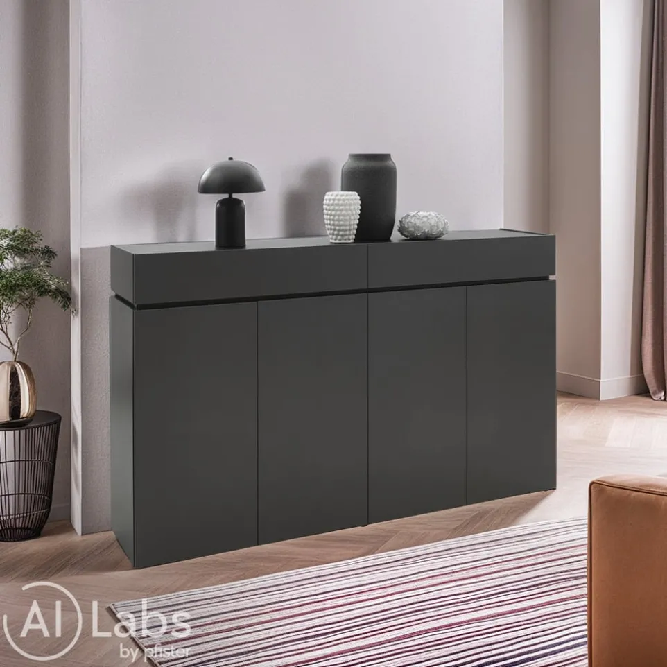 Das Sideboard Unique von Voleo vereint stilvolle Funktionalität mit durchdachtem Design. Mit seinen vier Türen und zwei Schubladen bietet es reichlich Stauraum für all deine Wohnaccessoires. Die Türdämpfung sorgt für ein sanftes Schliessen, während der Selbsteinzug Komfort und Effizienz bringt. Dank der verstellbaren Funktionen passt sich das Sideboard deinen individuellen Bedürfnissen an. Gefertigt aus hochwertiger Spanplatte, steht es für Robustheit und Langlebigkeit. Die Kunststoffgleiter schützen deinen Boden, während die montierbare Kippsicherung Sicherheit gewährleistet. Ein Sideboard, das deinem Zuhause Eleganz und Praktikabilität verleiht.
