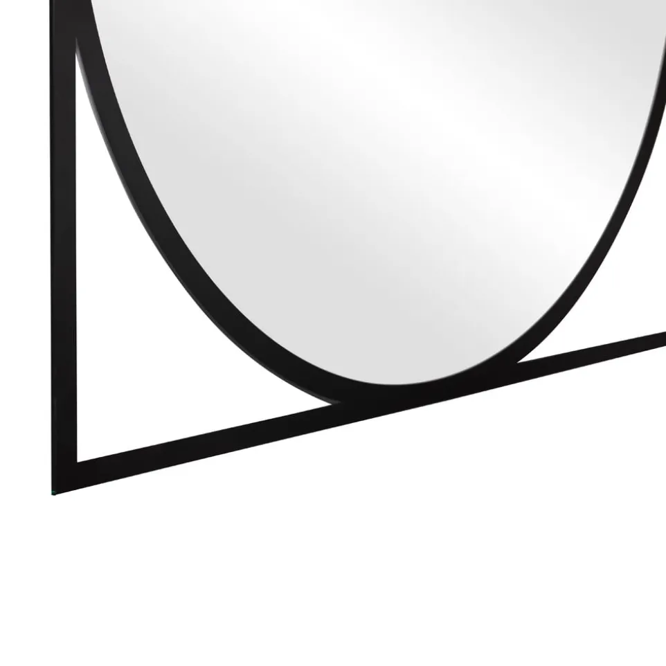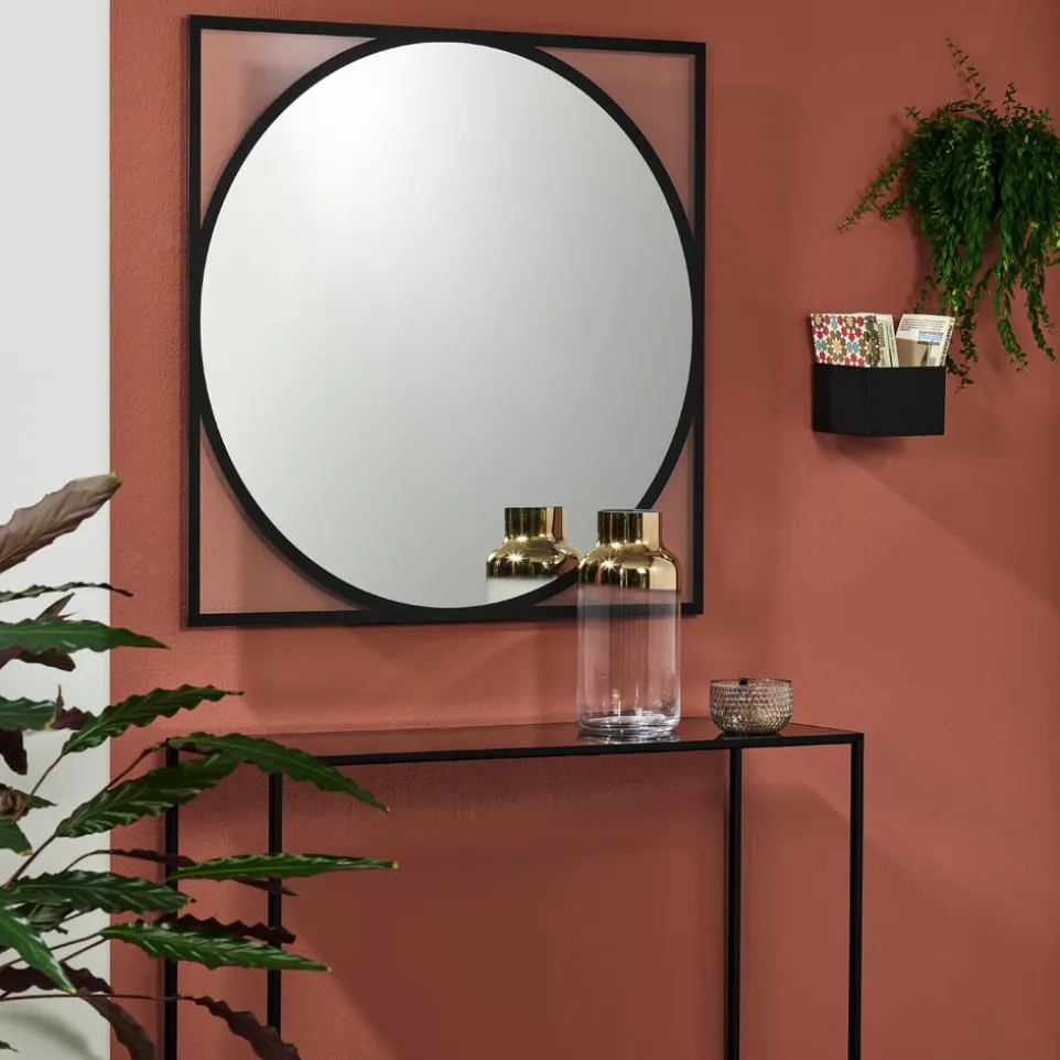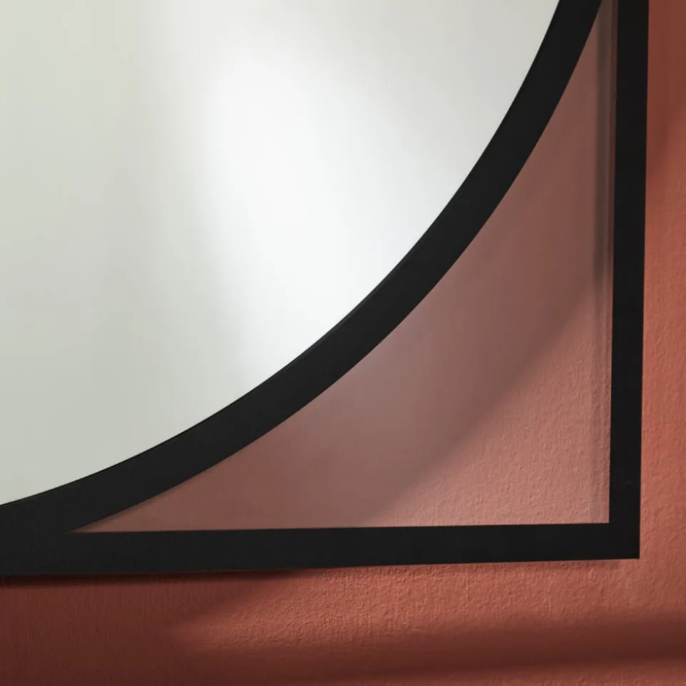 CIRCO Designspiegel der belgischen Marke Deknudt Mirrors fällt mit seinem exklusiven Design auf. Der runde Spiegel ist im Quadrat platziert und umrandet von einem schwarzen Metallrahmen. Die Ecken rund um den Kreis sind aus transparentem Glas gefertigt, sodass die Rückwand ersichtlich ist.