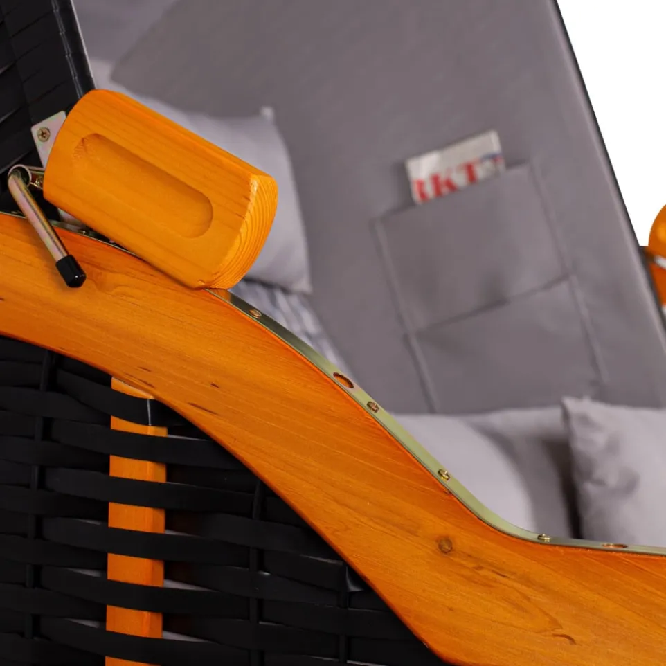 | Ausstattung | Massivholzgestell, wetterfestes Kunstrattan, zwei klappbare Tische, herausziehbare Fussstützen |