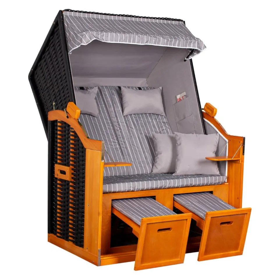 Tauche ein in den ultimativen Komfort des Strandkorb Ostsee mit seinem herausziehbaren Fussstützen und zwei klappbaren Tischen. Das robuste Massivholzgestell und das wetterfeste Kunstrattan machen ihn zur perfekten Wahl für alle Jahreszeiten. Ob bei strahlendem Sonnenschein oder eisigen Temperaturen, die wetterbeständigen und winterharten Materialien halten allen Bedingungen stand. Der Strandkorb Ostsee bietet dir die ideale Kombination aus Funktionalität und Stil für deinen Aussenbereich. Entspanne dich stilvoll und geniesse die Vorzüge eines echten Küstenklassikers in deinem Garten oder auf deiner Terrasse. Hol dir jetzt diesen zeitlosen Begleiter für unvergessliche Stunden.