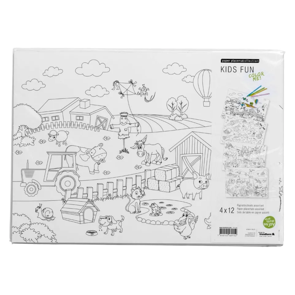 Dank dieses Tischsets zum Ausmalen erleben die kleinen Gäste ein grosses Abenteuer. Gemeinsam mit ihren Farbstiften reiten sie auf dem Bauernhof, fliegen im Weltall, entdecken das Märchenland oder tauchen bis zum Meeresgrund. Die grossen Gäste kriegen davon nichts mit. Sie geniessen ungestört das feine Essen. Von jedem der 4 Ausmal-Sujets gibt es 12 Stück.