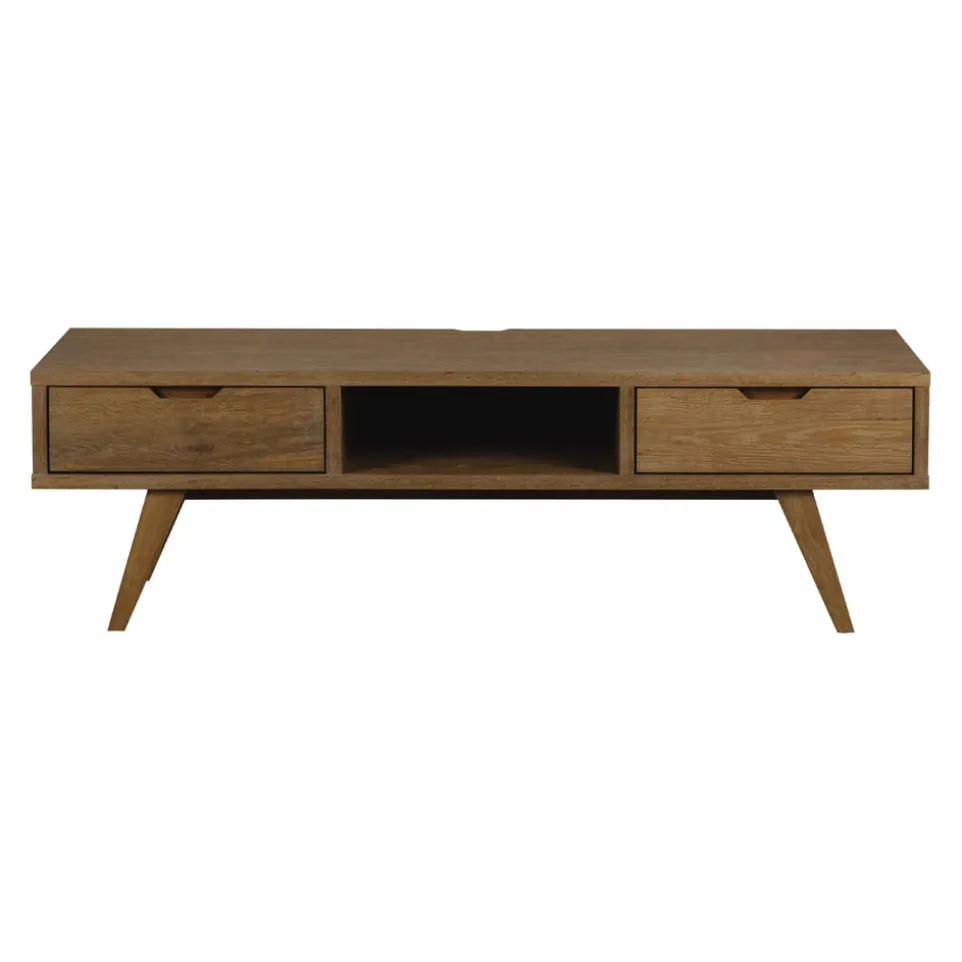 Inspiriert von moderner Eleganz, präsentiert sich das TV-Möbel A-Line von MID.YOU als stilvolle Ergänzung für dein Wohnzimmer. Gefertigt aus hochwertigem Holzwerkstoff mit Eichenoptik, kombiniert es die Wärme von Naturmaterialien mit der Funktionalität einer Spanplatte. Zwei praktische Schubladen bieten dir ausreichend Stauraum für Medienzubehör oder andere Gegenstände. Als Kastenmöbel konzipiert, fügt sich das TV-Möbel harmonisch in verschiedene Einrichtungsstile ein und schafft ein aufgeräumtes Ambiente. Die sorgfältige Verarbeitung macht es zu einem langlebigen Begleiter, der dir lange Freude bereiten wird. Entdecke die Vielseitigkeit dieses Möbelstücks.
