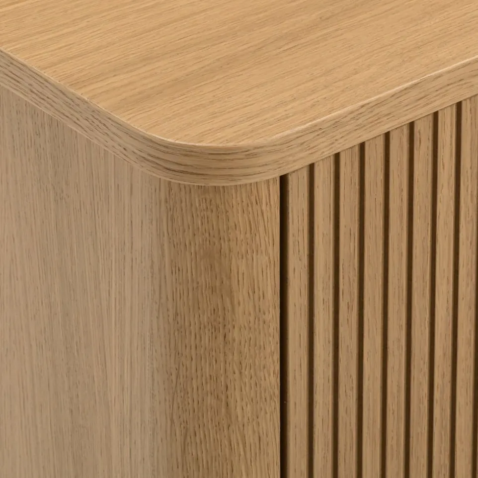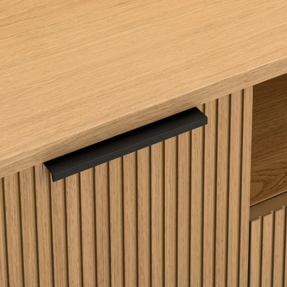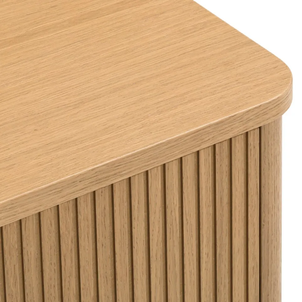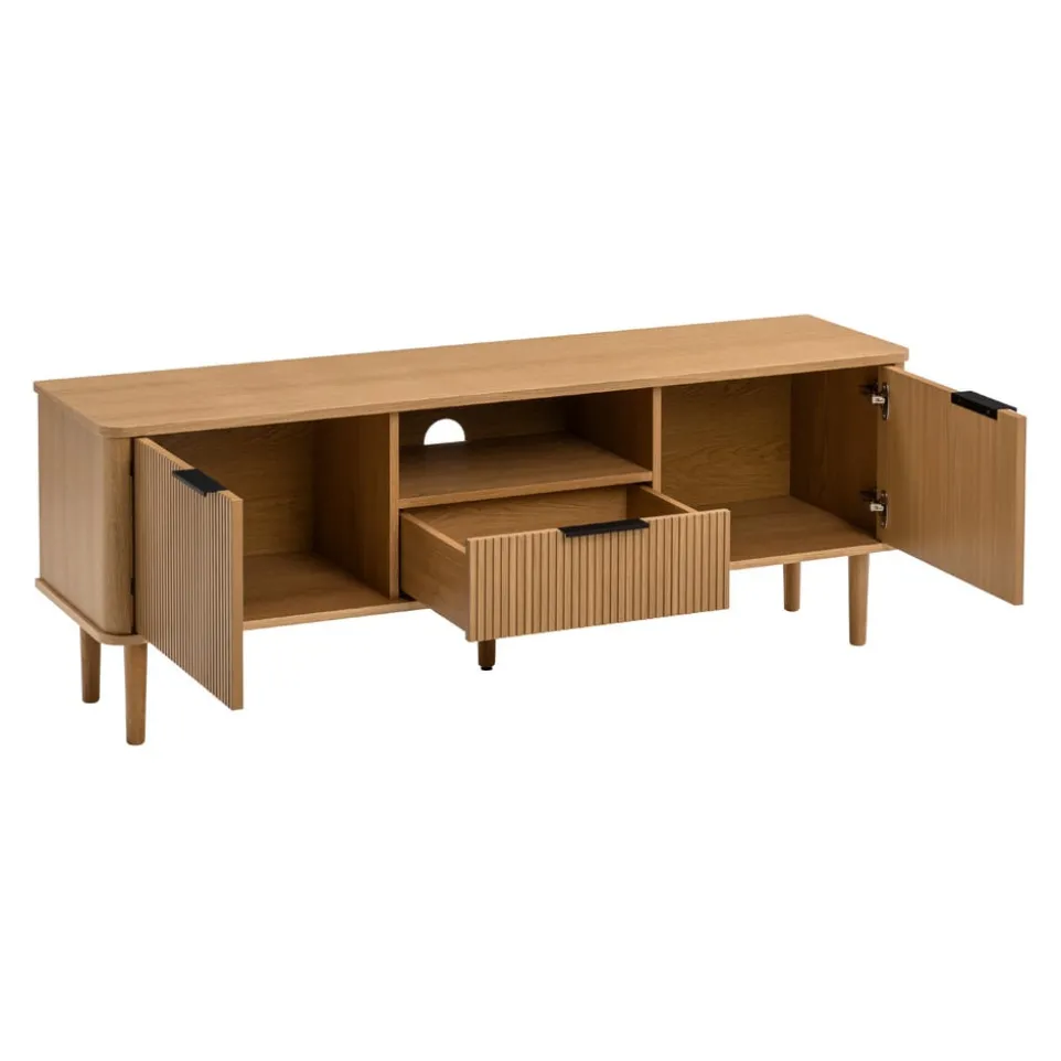 Das TV-Möbel Skasen von edy&liv besticht durch seine edle furnierte Eiche, die deinem Wohnzimmer einen Hauch von Eleganz verleiht. Hergestellt aus hochwertigem Holzwerkstoff, bietet es nicht nur Stabilität, sondern auch eine stilvolle Optik. Mit einer praktischen Schublade ausgestattet, sorgt das Möbelstück für zusätzlichen Stauraum und hält deine Mediengeräte ordentlich organisiert. Dank des FSC®-Mix-Zertifikats kannst du sicher sein, dass das Holz aus verantwortungsvollen Quellen stammt. Setze mit dem TV-Möbel Skasen ein Highlight in deinem Zuhause und kombiniere stilvolles Design mit nachhaltiger Qualität von edy&liv.