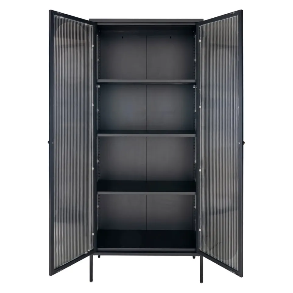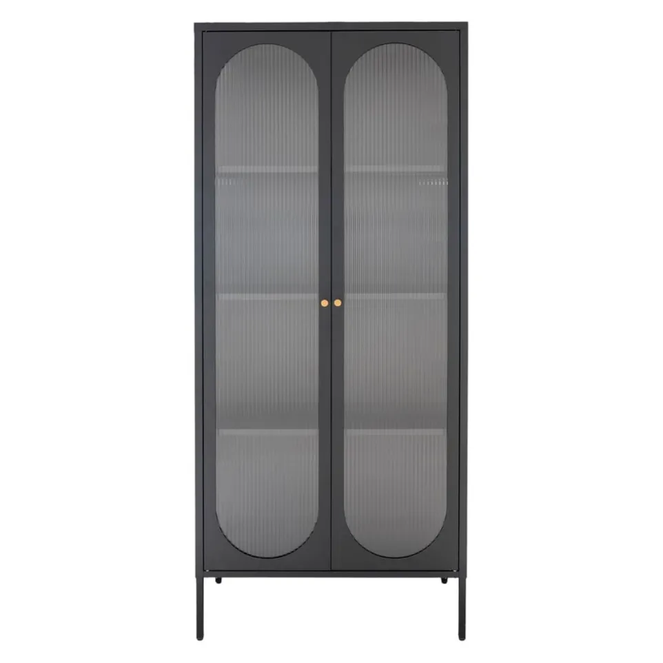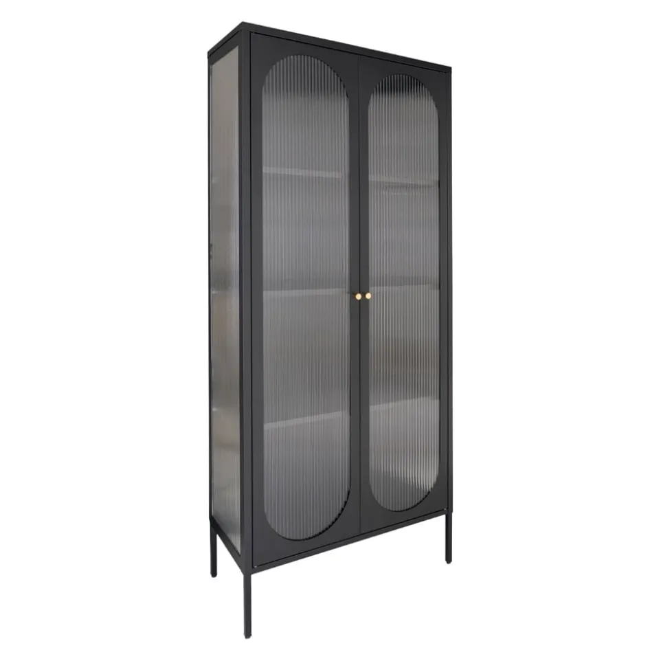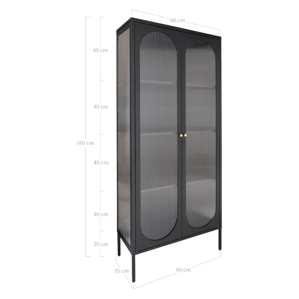 Die Vitrine Aeneas von Johann Jakob besticht durch ihre zwei eleganten Türen aus geriffeltem Glas, die einen stilvollen Blickfang in deinem Zuhause darstellen. Gefertigt aus robustem Metall, bietet sie eine stabile und langlebige Aufbewahrungsmöglichkeit für deine wertvollen Sammlerstücke. Mit den Massen 80x35x180 cm ist die Vitrine ideal, um in jedem Raum Akzente zu setzen und gleichzeitig Ordnung zu schaffen. Ob im Wohnzimmer, Esszimmer oder Büro, die Vitrine Aeneas fügt sich nahtlos in verschiedene Einrichtungsstile ein und verleiht deinem Interieur einen Hauch von moderner Eleganz.