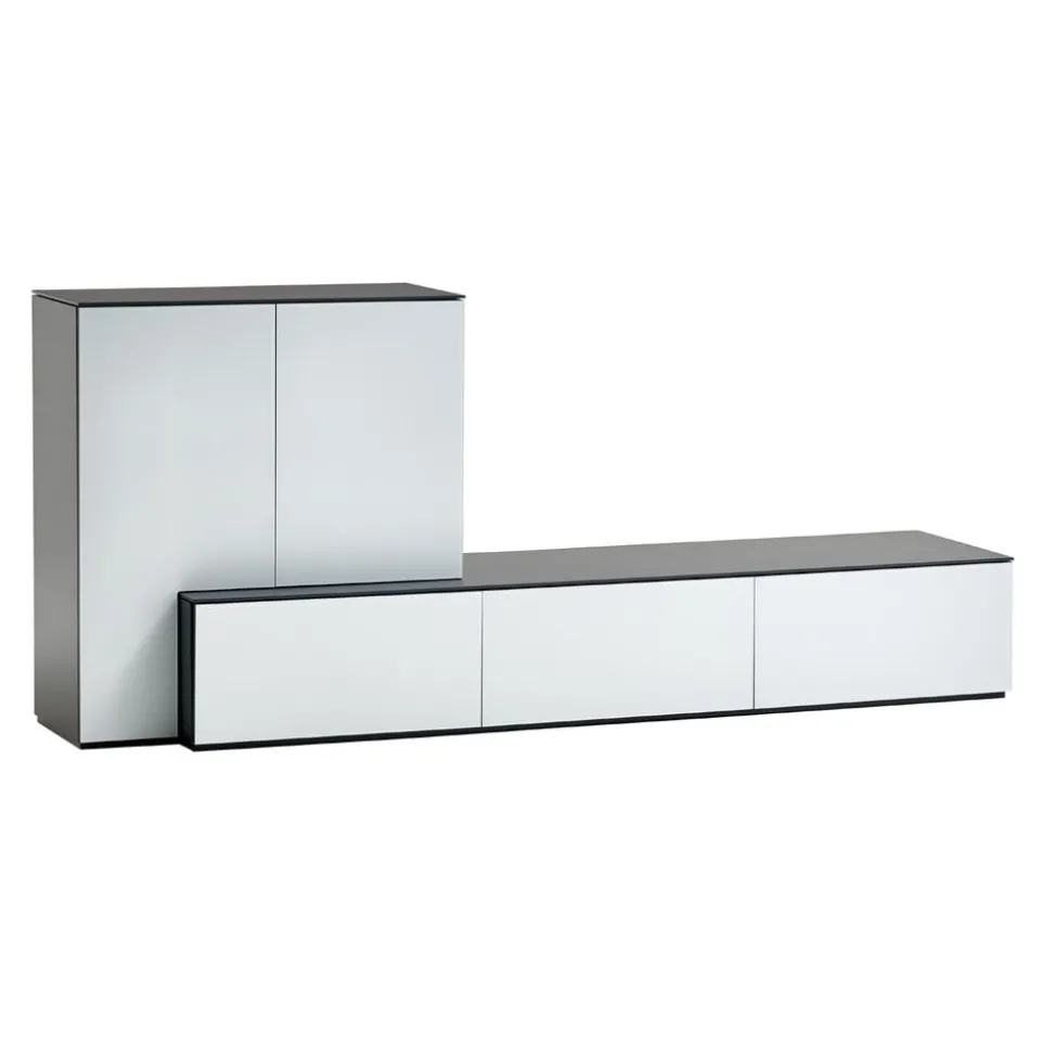Wow, fast schon ein kubistisches Kunstwerk! Die Wohnkombination TIMBER wird garantiert zum neuen Star in Ihrem Wohnzimmer. Die 2 unkonventionell miteinander verschachtelten Elemente bilden eine einzigartige Einheit. Die Wohnkombination aus lackiertem Holz in Weiss hat 2 Türen und 1 Klappe – allesamt aus Glas und mit Push-out-System. Die Wohnkombination ist individuell zusammenstellbar und bietet viel Stauraum. Sie ist in anderen Grössen, Holzarten und Varianten erhältlich. Von der Serie TIMBER gibt’s auch ein Sideboard. Swiss-made.