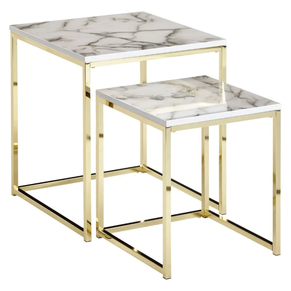 Bereichere dein Zuhause mit dem eleganten Zweisatztisch Marmor von MID.YOU. Diese stilvollen Tische aus hochwertigem Holz bezaubern mit ihrer quadratischen Form und passen perfekt in jedes moderne Ambiente. Der grosse Tisch misst 45x45x50 cm, während der kleinere Tisch mit 35x35x40 cm ideal für kompaktere Räume ist. Die klaren Linien und die handwerkliche Verarbeitung machen diese Tische zu einem wahren Blickfang. Ob als dekorative Ablage für deine Lieblingsbücher oder als stilvolle Ergänzung im Wohnzimmer, der Zweisatztisch Marmor bringt zeitlose Eleganz in dein Zuhause. Entdecke die Vielseitigkeit und Funktionalität dieses hochwertigen Möbelstücks.